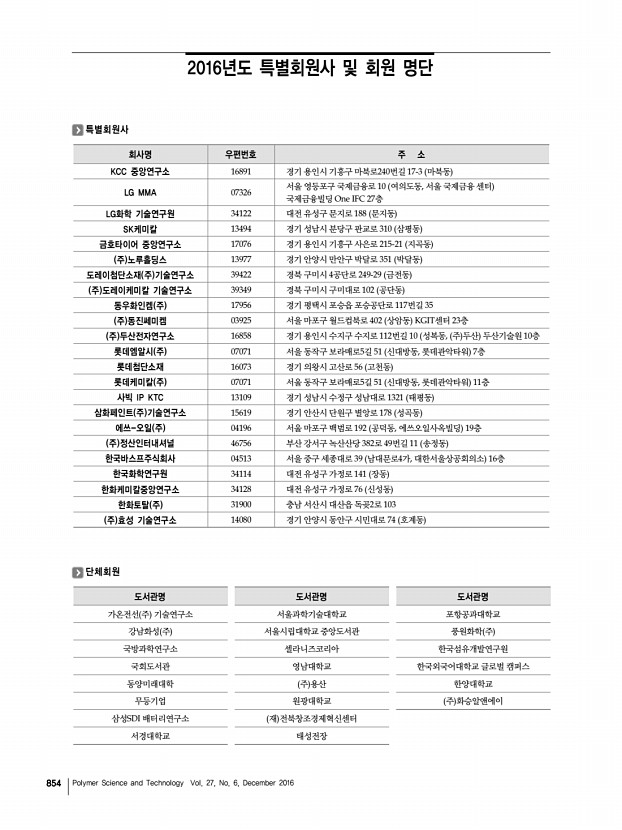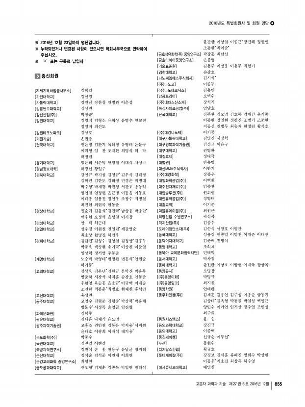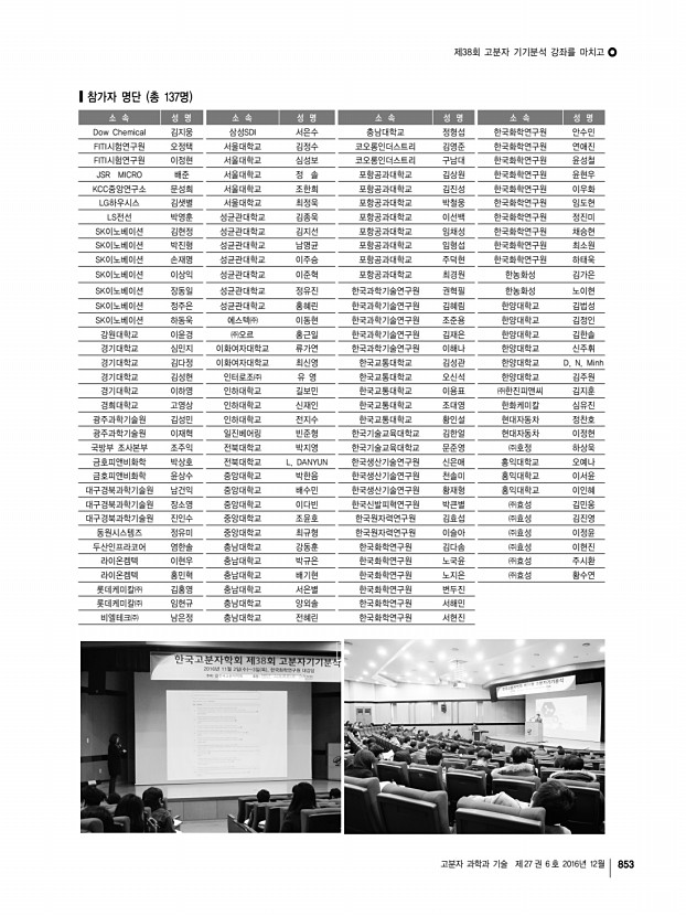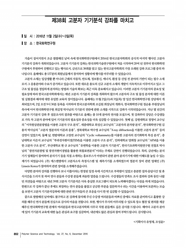 852 Polymer Science and Technology Vol. 27, No. 6, December 2016 제38회 고분자 기기분석 강좌를 마치고 일 시 2016년 11월 2일 수 3일 목 장 소 한국화학연구원 가을이 짙어지면서 조금 쌀쌀해진 날씨 속에 한국화학연구원에서 2016년 한국고분자학회의 공식적 마지막 행사인 고분자 기기분석 강좌가 개최되었습니다. 고분자 기기분석 강좌는 한국과학기술연구원에서 처음 시작하여 20여 년 전부터 한국화학연 구원에서 후원하여 진행되고 있는 행사로서, 금년으로 38회를 맞고 있는 한국고분자학회의 가장 오래된 강좌 프로그램 중의 하 나입니다. 올해에도 총 137분의 회원님들께서 참석하여 성황리에 행사를 마무리할 수 있었습니다. 고분자 소재는 일상생활 뿐 아니라 근래의 자동차, 반도체, 정보통신, 에너지, 환경 등 산업 전 분야의 기반이 되는 필수 소재 로서 그 응용...