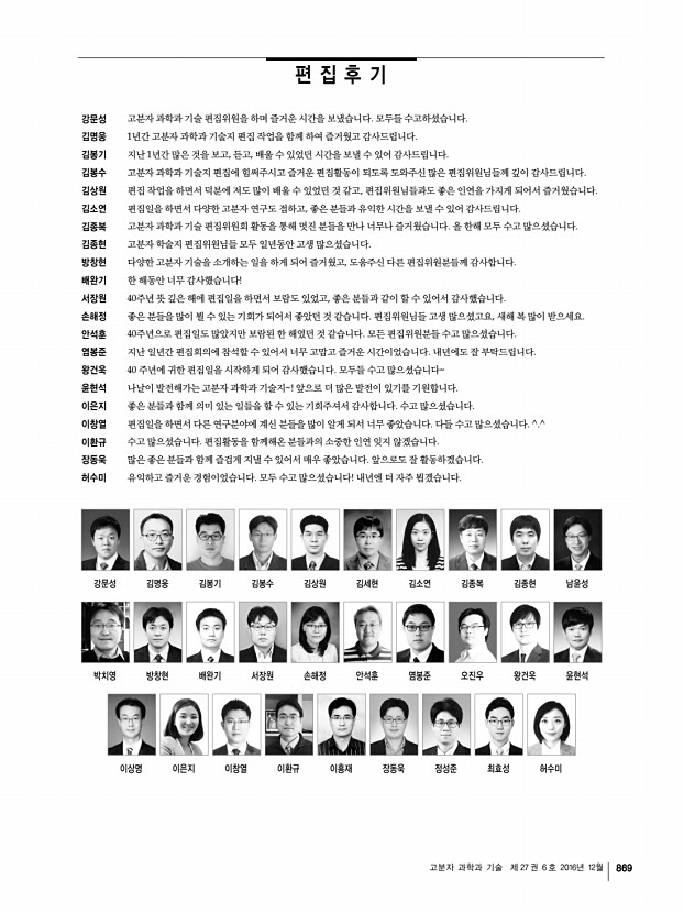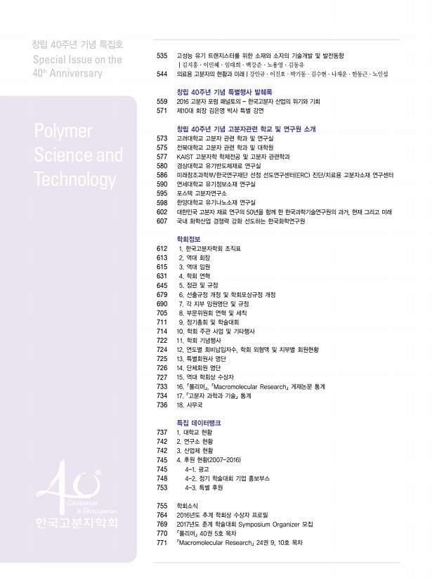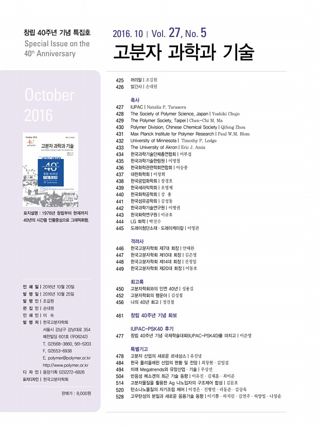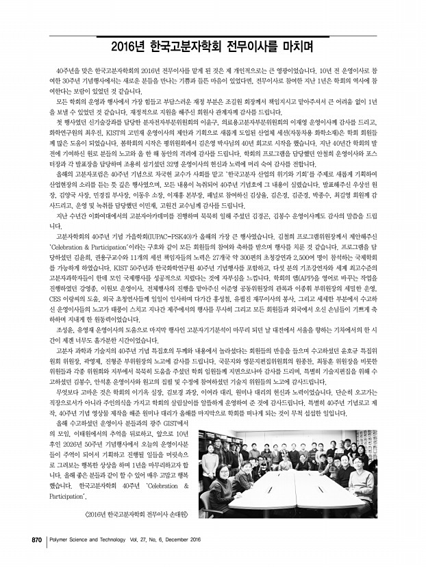 ...ration & Participation’이라는 구호와 같이 모든 회원들의 참여와 축하를 받으며 행사를 치룬 것 같습니다. 프로그램을 담 당하셨던 김윤희, 권용구교수와 11개의 세션 책임자들의 노력은 27개국 약 300편의 초청강연과 2,500여 명이 참석하는 국제학회 를 가능하게 하였습니다. KIST 50주년과 한국화학연구원 40주년 기념행사를 포함하고, 다섯 분의 기조강연자와 세계 최고수준의 고분자과학자들이 한데 모인 국제행사를 성공적으로 치렀다는 것에 자부심을 느낍니다. 학회의 앱 APP 을 영어로 바꾸는 작업을 진행하였던 강영종, 이원보 운영이사, 전체행사의 진행을 맡아주신 이준영 공동위원장의 관록과 이종휘 부위원장의 세밀한 운영, CES 이랑씨의 도움, 외국 초청연사들께 일일이 인사하며 다가간 홍성철, 유필진 재무이사의 봉사, 그리고 세세한 부분에서 수...