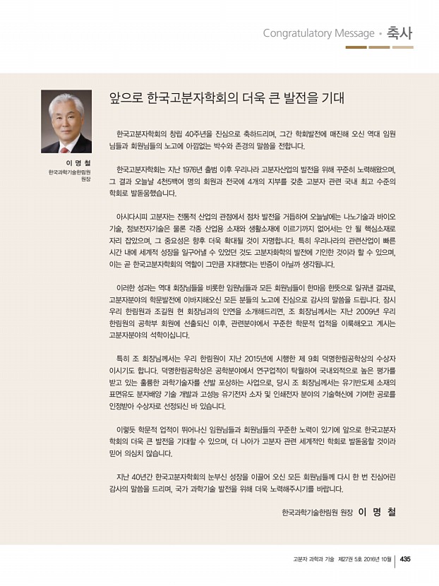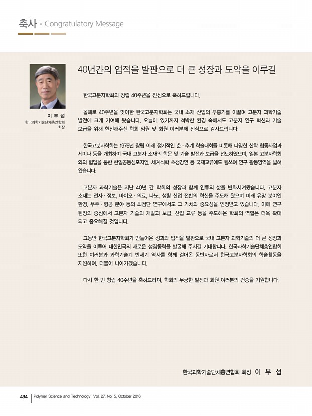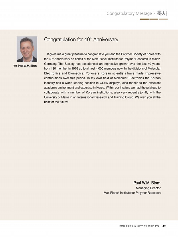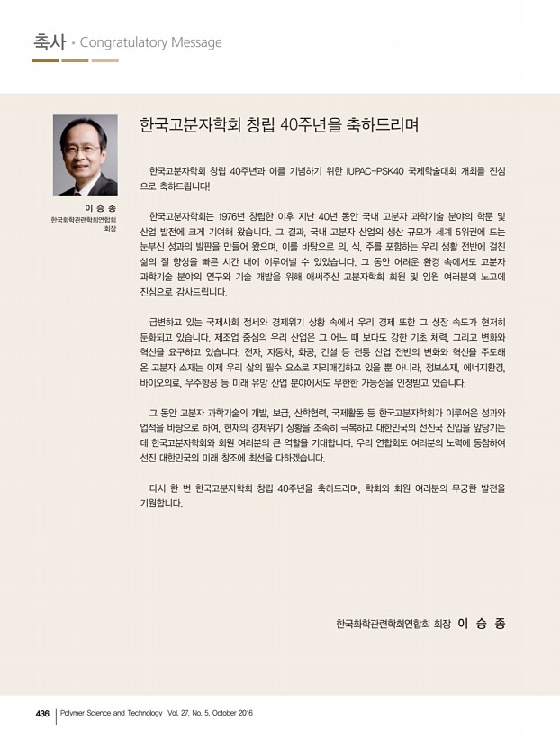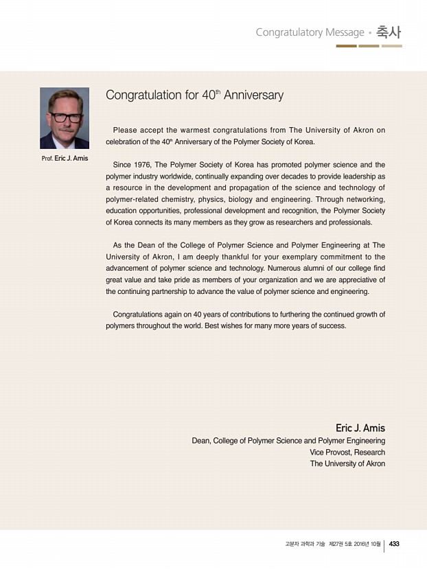 고분자 과학과 기술 제27권 5호 2016년 10월 433 Please accept the warmest congratulations from The University of Akron on celebration of the 40th Anniversary of the Polymer Society of Korea. Since 1976, The Polymer Society of Korea has promoted polymer science and the polymer industry worldwide, continually expanding over decades to provide leadership as a resource in the development and propagation of the science and technology of polymer-related chemistry, physics, biology and engineering. Through networking, education opportunities, professional development and recognition, the Polymer Society of Korea connects its many members as they grow as researchers and professionals. As the Dean of the College of Polymer Science and Polymer Engineering at The University of Akron, I am deeply thankful for your exemplary commitment to the advancement of polymer science and technology. Numerous alumni of our college find great value and take pride as members of your organization and w...