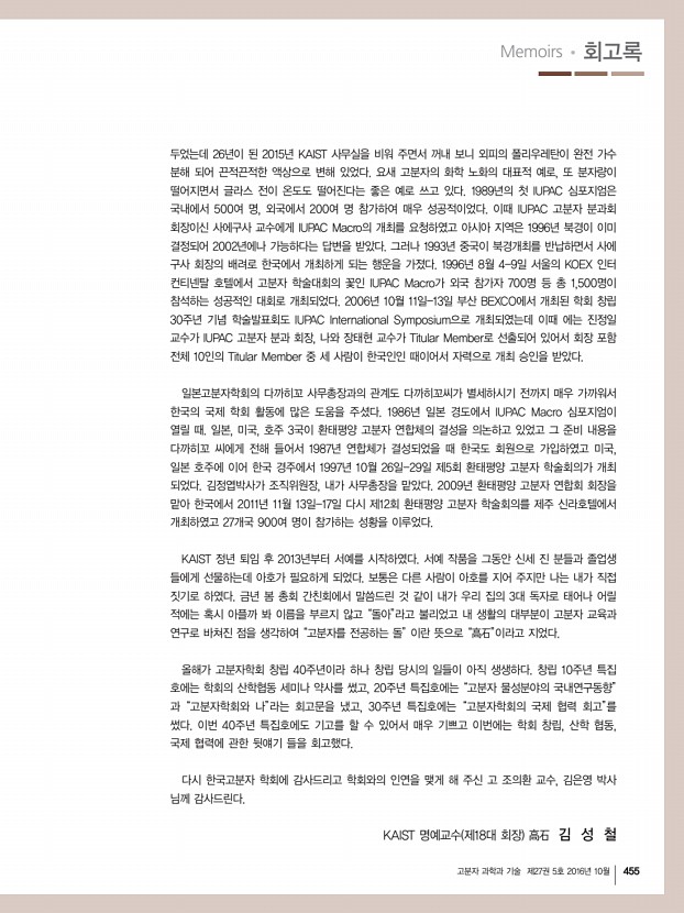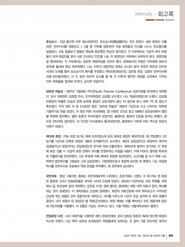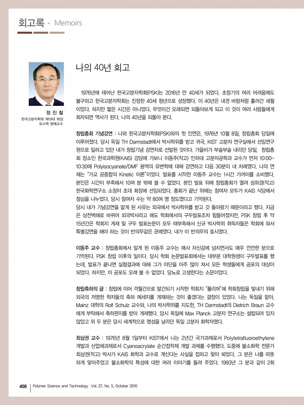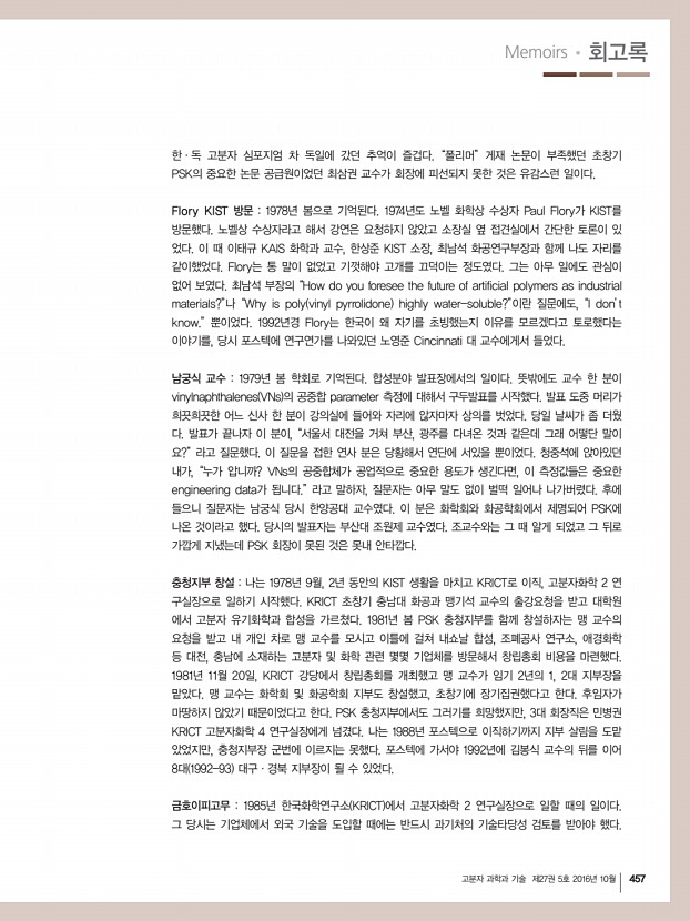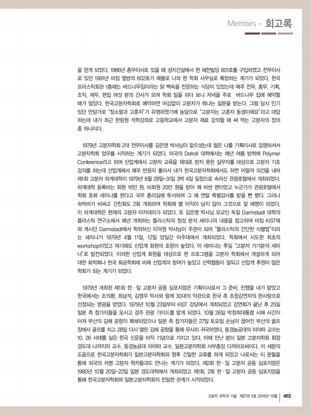 ... 것이 여러 사람들에게 회자되면 역사가 된다. 나의 40년을 되돌아 본다. 창립총회 기념강연 나와 한국고분자학회 PSK 와의 첫 인연은, 1976년 10월 8일, 창립총회 당일에 이루어졌다. 당시 독일 TH Darmstadt에서 박사학위를 받고 귀국, KIST 고분자 연구실에서 선임연구 원으로 일하고 있던 내가 창립기념 강연자로 선발된 것이다. 가을비가 부슬부슬 내리던 당일, 창립총 회 장소인 한국과학원 KAIS 강당에 가보니 이동주 작고 인하대 고분자공학과 교수가 먼저 1000- 1030에 Polyisocyanate/DMF 용액의 유변학에 대해 강연하고 다음 30분이 내 차례였다. 나의 연 제는“가교 공중합의 Kinetic 이론”이었다. 발표를 시작한 이동주 교수는 1시간 가까이를 소비했다. 본인은 시간이 부족해서 10여 분 밖에 쓸 수 없었다. 본인 발표 뒤에 창립총회가 열려 성좌경 작고 한국화학연구...