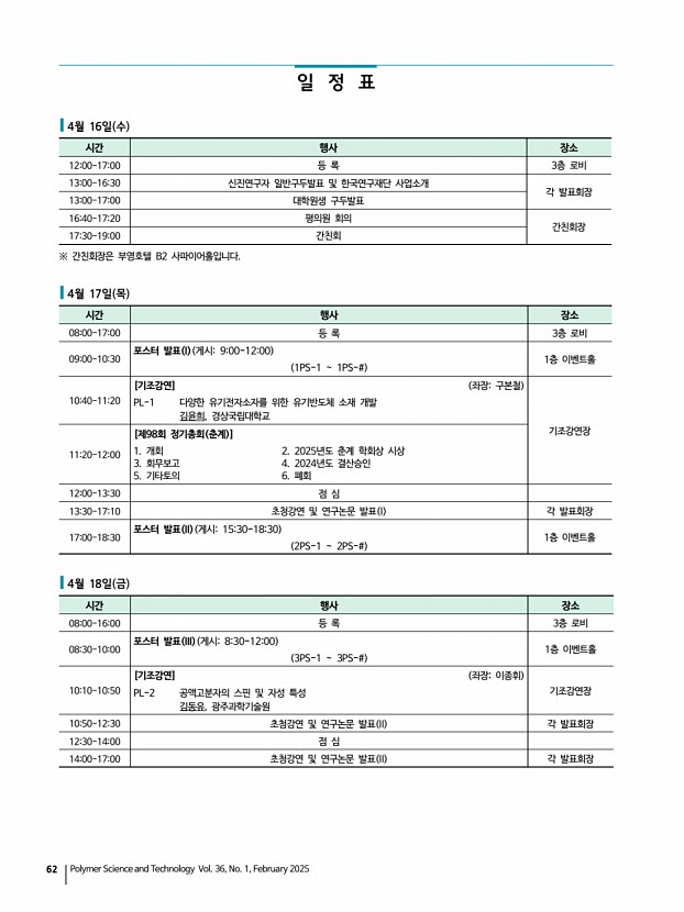 고분자 과학과 기술 제 36 권 1 호 2025년 2월 61 | 사전등록 본 추계학술대회에 참석을 희망하시는 분은 2025년 3월 21일 금 까지 홈페이지 www.polymer.or.kr 에서 회원 로그인을 하시고 사전등록비를 납입하시면 됩니다. 불가피한 사정으로 인한 환불은 4월 9일 수 까지만 가능합니다 주말 및 공휴일 제외 사전등록을 on-line으로 하신 분은 회비 납부 내역에서 영수증을 인쇄할 수 있습니다. ◆고분자학회의 회원만 사전등록이 가능하며, 2025년도 연회비 미납 시에는 사전등록을 하실 수 없습니다. 연회비와 사전등록비는 함께 납부하실 수 있습니다. 회원구분 연회비 사전등록비 현장등록비 A B 1년연회비면제 A B 1년연회비면제 종신회원 130,000 150,000 정회원 일반 50,000 130,000 180,000 150,000 200,000 학생회원 30,000 60,000 90,000 70,000 100,000 비회원 160,000 180,000 | 논문정보보기 · ...