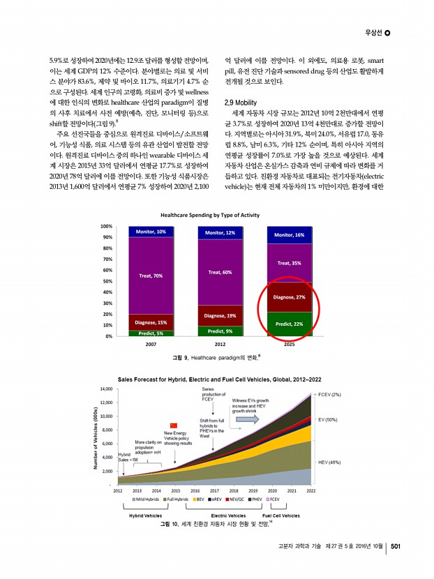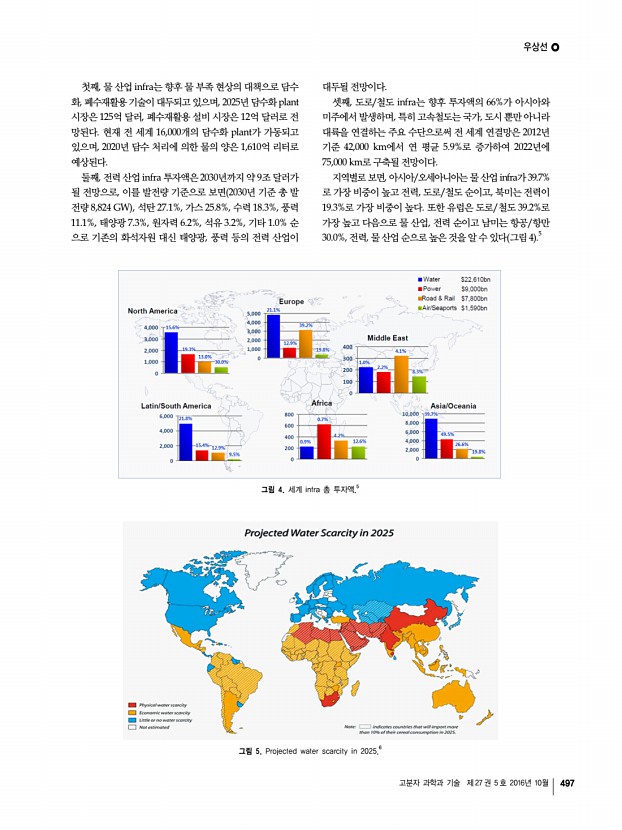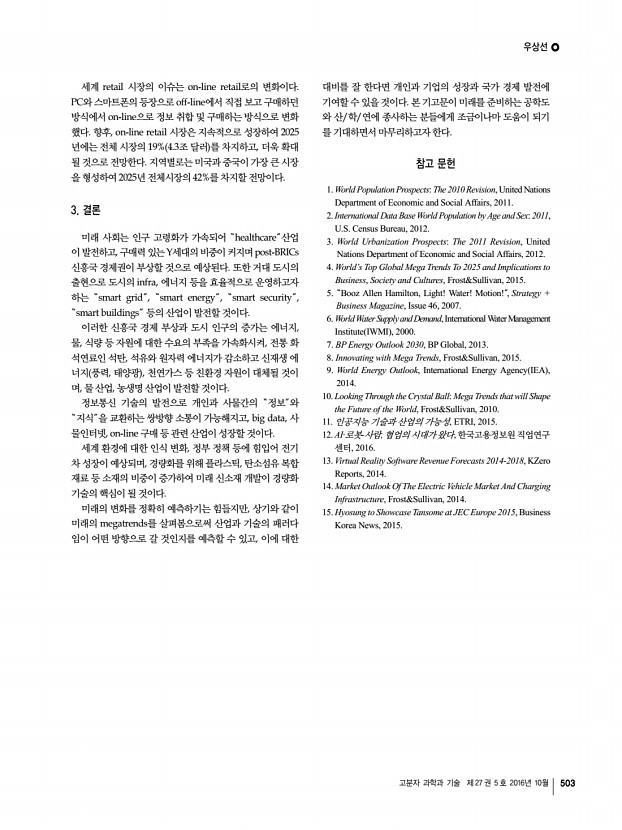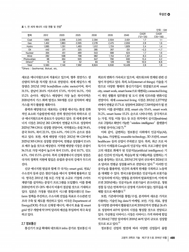 우상선 고분자 과학과 기술 제 27 권 5 호 2016년 10월 499 항목 2012 2020 2025 2030 2035 2040 CAGR 1225 CAGR 2540 Coal 1,805 2,096 2,245 2,394 2,504 2,631 1.7 1.1 Gas 1,462 1,883 2,095 2,278 2,475 2,659 2.8 1.6 Hydro 1,085 1,351 1,483 1,612 1,724 1,829 2.4 1.4 Oil 442 371 325 285 267 251 -2.3 -1.7 Nuclear 394 451 489 543 588 624 1.7 1.6 Wind 282 598 798 982 1,154 1,321 8.3 3.4 Photovoltaic 98 364 505 647 790 930 13.4 4.2 Others* 15 32 52 83 128 183 10.0 8.8 Total 5,583 7,146 7,992 8,824 9,630 10,428 2.8 1.8 *Others Geothermal, Biofuel, etc. 표 1. 전 세계 에너지 시장 현황 및 전망9 단위 GW 새로운 에너지원으로써 적용되고 있으며, 향후 천연가스 생 산량의 50%를 차지할 것으로 전망된다. 세계 셰일가스 매 장량은 2012년 19만 bcm billion cubic meter 이며, 북미 31.5%, 중남미 20.0% 아프리카 17.0%, 아시아 16.3%, 기타 15.2% 순이다. 셰일가스 매장량이 가장 높은 북미지역은 2020년까지 ...