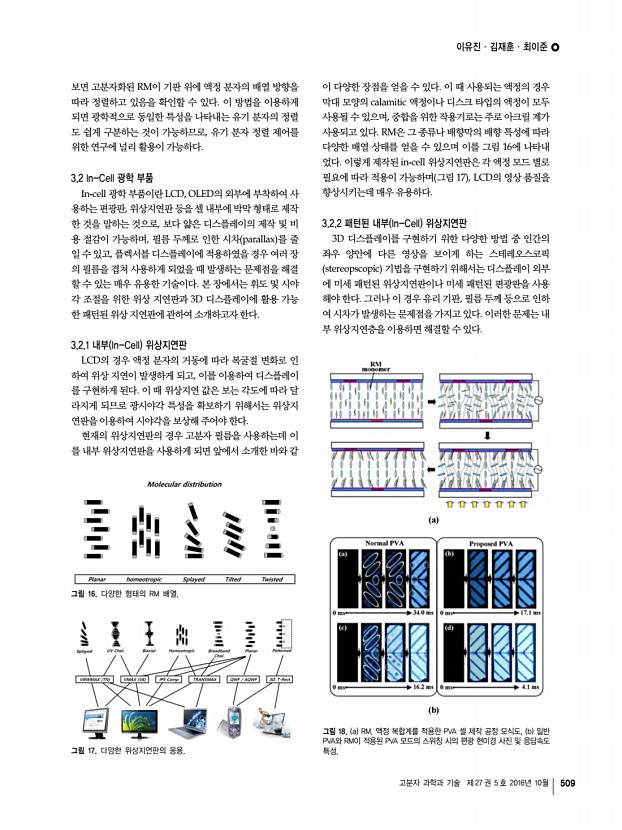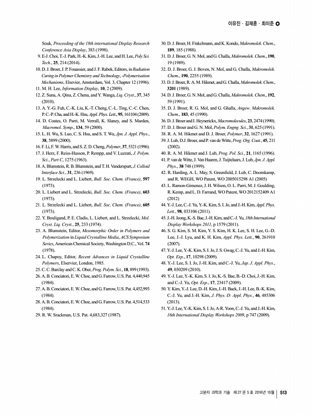 이유진ㆍ김재훈ㆍ최이준 고분자 과학과 기술 제 27 권 5 호 2016년 10월 513 Souk, Proceeding of the 18th international Display Research Conference Asia Display, 383 1998 9. E-J. Choi, T.-J. Park, H.-K. Kim, J.-H. Lee, and H. Lee, Poly Sci. Tech., 25, 214 2014 10. D. J. Broer, J. P. Fouassier, and J. F. Rabek, Editors, in Radiation Curing in Polymer Chemistry and Technology, -Polymerisation Mechanisms, Elsevier, Amsterdam, Vol. 3, Chapter 12 1996 11. M. H. Lee, Information Display, 10, 2 2009 12. Z. Suna, A. Qina, Z. Chena, and Y. Wanga, Liq. Cryst., 37, 345 2010 13. A. Y.-G. Fuh, C.-K. Liu, K.-T. Cheng, C.-L. Ting, C.-C. Chen, P. C.-P. Cha, and H.-K. Hsu, Appl. Phys. Lett., 95, 161104 2009 14. D. Coates, O. Parri, M. Verrall, K. Slaney, and S. Marden, Macromol. Symp., 134, 59 2000 15. L. H. Wu, S. Luo, C. S. Hsu, and S. T. Wu, Jpn. J. Appl. Phys., 38, 5899 2000 16. F. Li, F. W. Harris, and S. Z. D. Cheng, Polymer, 37, 5321 1996 17. J. Herz, F. Reiss-Husson, P. Rempp...