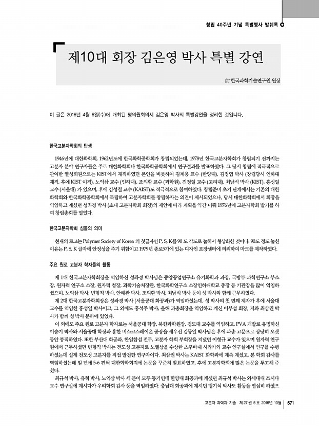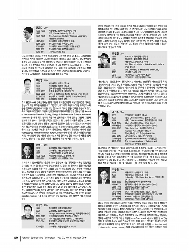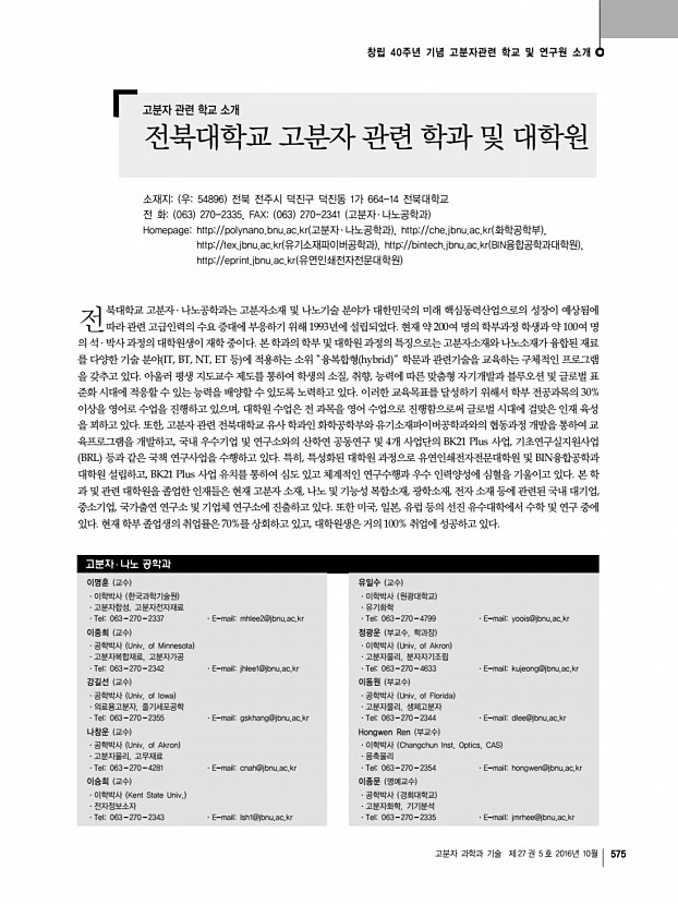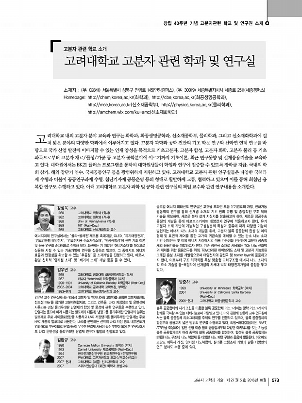 고분자 과학과 기술 제 27 권 5 호 2016년 10월 573 고분자 관련 학교 소개 고려대학교 고분자 관련 학과 및 연구실 소재지 우02841 서울특별시 성북구 안암로 145 안암캠퍼스 , 우30019 세종특별자치시 세종로 2511 세종캠퍼스 Homepagehttp//chem.korea.ac.kr 화학과 , http//cbe.korea.ac.kr 화공생명공학과 , http//mse.korea.ac.kr 신소재공학부 , http//physics.korea.ac.kr 물리학과 , http//amchem.wix.com/ku-amc 신소재화학과 고려대학교 내의 고분자 분야 교육과 연구는 화학과 쳐 넓은 분야의 다양한 학과에서 이루어지고 있다,.화공생명공학과 고분자 과학과 공학 전반의 기초 학문 연구와 산학연 연계 연구를 바 , 신소재공학부, 물리학과, 그리고 신소재화학과에 걸 탕으로 국가 산업 발전에 이바지할 수 있는 인재 양성을 목적으로 기초고분자, 고분자 합성, 고분자 화학, 고분자 물리 등 기초 ...