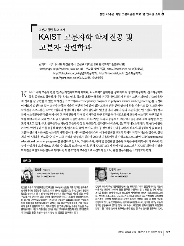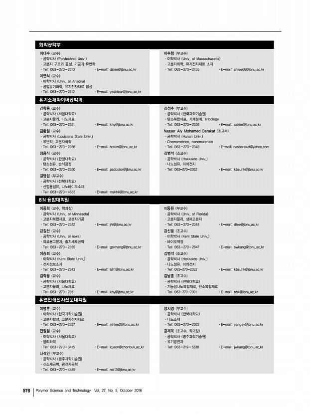 ..., 나노재료 ·Tel063-270-2351 ·E-mailkhy@jbnu.ac.kr 김환철 교수 ·공학박사 Louisiana State Univ. ·유변학, 고분자화학 ·Tel063-270-2356 ·E-mailhckim@jbnu.ac.kr 정용식 교수 ·공학박사 한양대학교 ·탄소섬유, 습식공정 ·Tel063-270-2350 ·E-mailpsdcolor@jbnu.ac.kr 길명섭 부교수 ·공학박사 전북대학교 ·산업용섬유, 나노바이오소재 ·Tel063-270-4635 ·E-mailmskhil@jbnu.ac.kr 김성수 부교수 ·공학박사 한국과학기술원 ·탄소복합재료, 기계설계, Tribology ·Tel063-270-2336 ·E-mailsskim@jbnu.ac.kr Nasser Aly Mohamed Barakat 조교수 ·공학박사 Hunan Univ. ·Chemometrics, nanomaterials ·Tel063-270-2349 ·E-mailnasbarakat@yahoo.com 김병석 조교수 ·공학박사 Hokkaido Univ. ·나노섬유, 이차전지 ·Tel063-270-2352 ·E-mailkbsuhk@jbnu.ac.kr BIN 융합대학원 이중희 교수, 학과장 ·공학박사 Univ. of Minnesota ·고분자복합재료, 고분자가공 ...