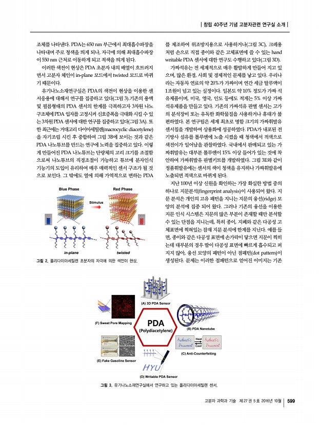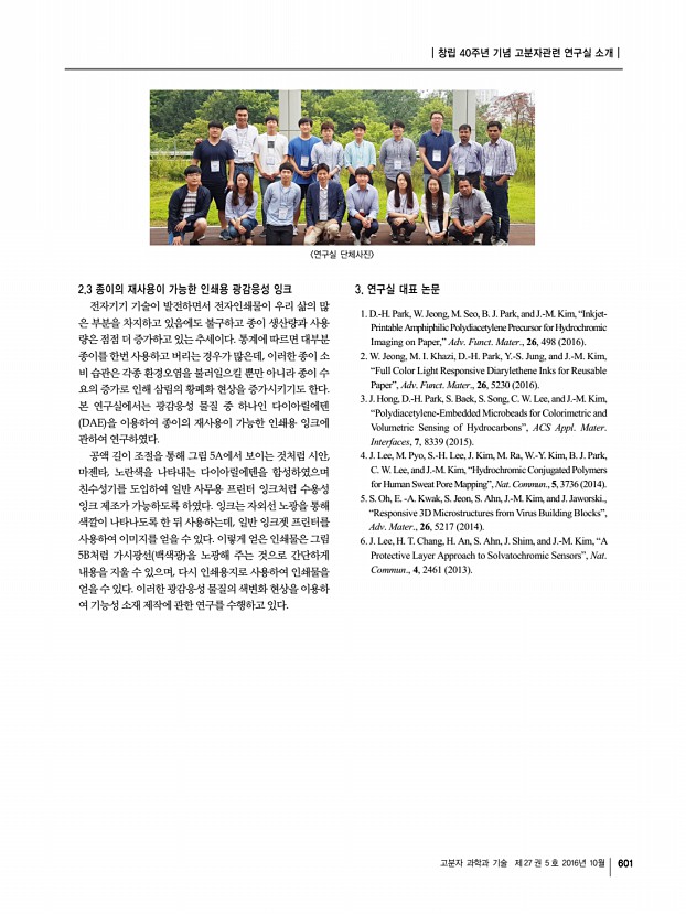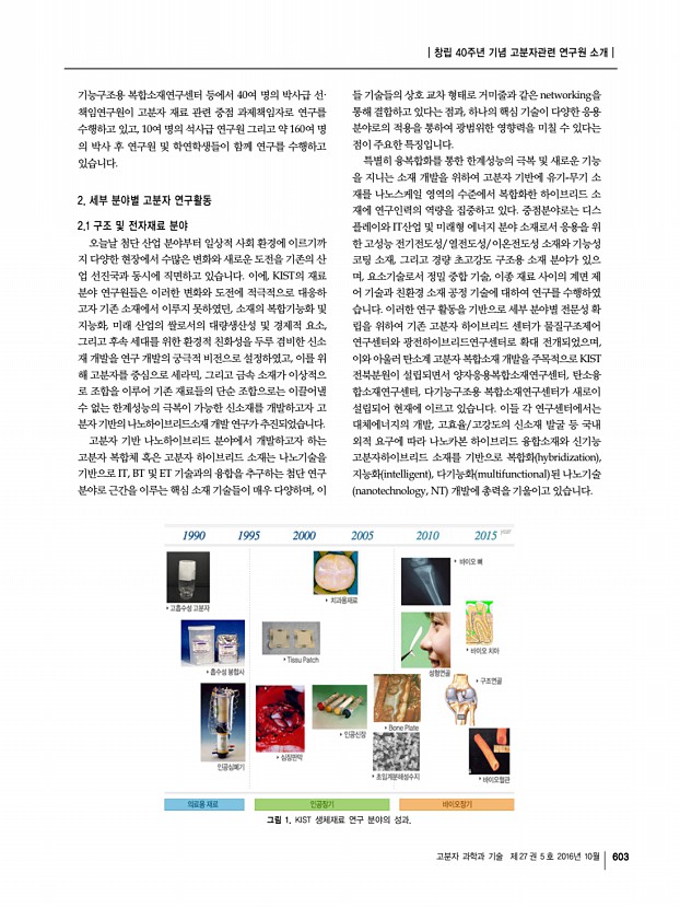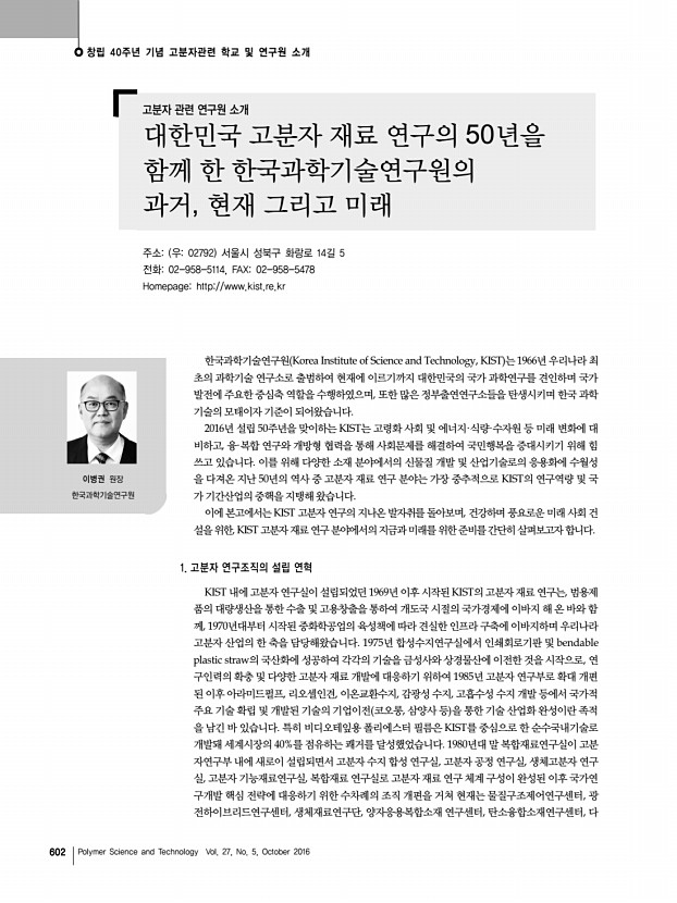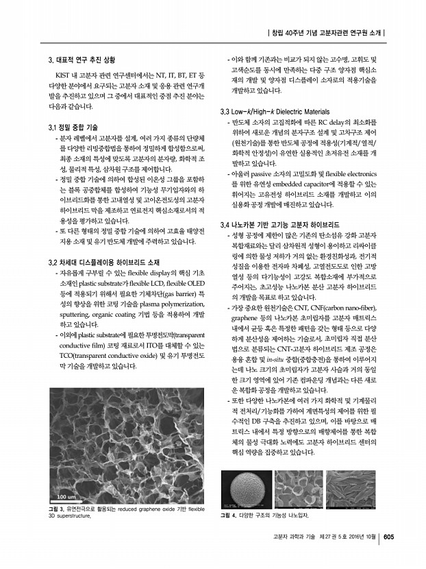 ┃창립 40주년 기념 고분자관련 연구원 소개┃ 고분자 과학과 기술 제 27 권 5 호 2016년 10월 605 그림 3. 유연전극으로 활용되는 reduced graphene oxide 기반 flexible 3D superstructure. 그림 4. 다양한 구조의 기능성 나노입자. 3. 대표적 연구 추진 상황 KIST 내 고분자 관련 연구센터에서는 NT, IT, BT, ET 등 다양한 분야에서 요구되는 고분자 소재 및 응용 관련 연구개 발을 추진하고 있으며 그 중에서 대표적인 중점 추진 분야는 다음과 같습니다. 3.1 정밀 중합 기술 분자 레벨에서 고분자를 설계, 여러 가지 종류의 단량체 를 다양한 리빙중합법을 통하여 정밀하게 합성함으로써, 최종 소재의 특성에 맞도록 고분자의 분자량, 화학적 조 성, 물리적 특성, 삼차원 구조를 제어합니다. 정밀 중합 기술에 의하여 합성된 이온성 그룹을 포함하 는 블록 공중합체를 합성하여 기능성 ...