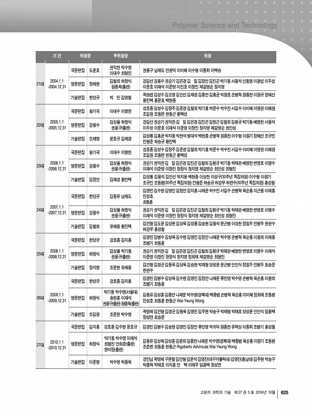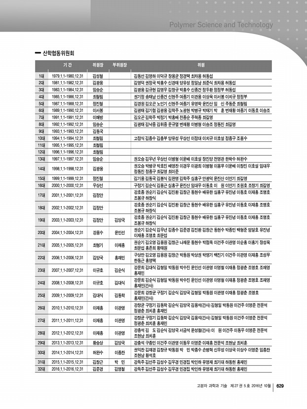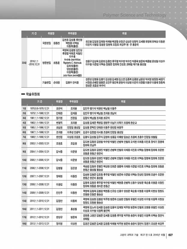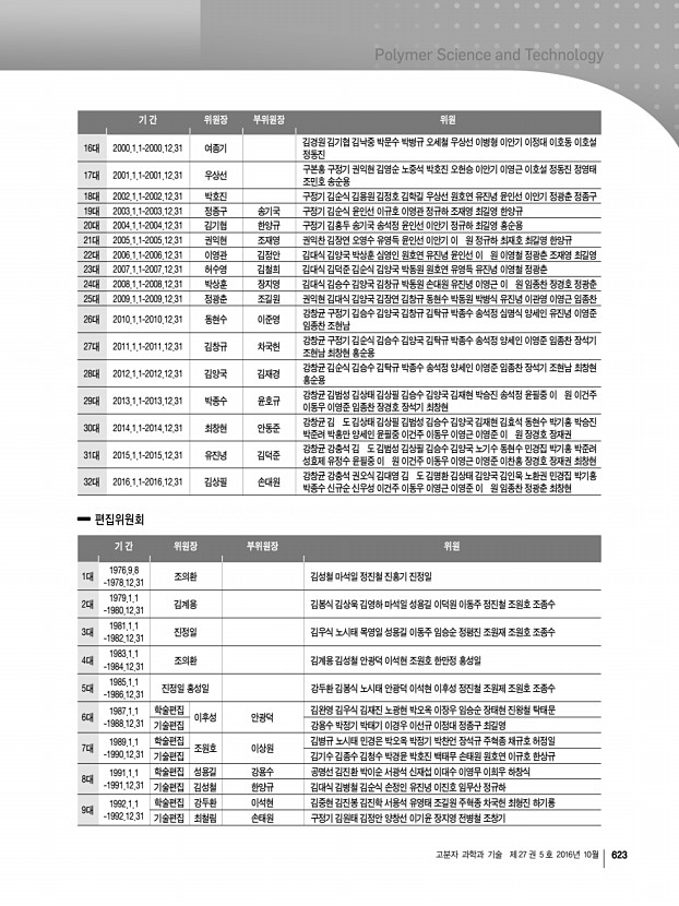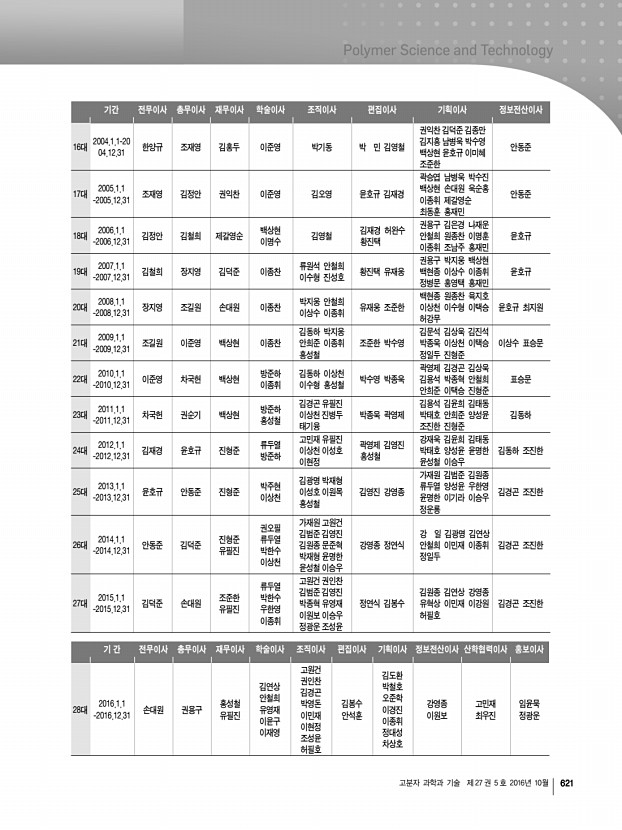 고분자 과학과 기술 제 27 권 5 호 2016년 10월 621 기간 전무이사 총무이사 재무이사 학술이사 조직이사 편집이사 기획이사 정보전산이사 16대 2004.1.1-20 04.12.31 한양규 조재영 김홍두 이준영 박기동 박 민 김영철 권익찬 김덕준 김종만 김지흥 남병욱 박수영 백상현 윤호규 이미혜 조준한 안동준 17대 2005.1.1 -2005.12.31 조재영 김정안 권익찬 이준영 김오영 윤호규 김재경 곽승엽 남병욱 박수진 백상현 손대원 욱순홍 이종휘 제갈영순 최동훈 홍재민 안동준 18대 2006.1.1 -2006.12.31 김정안 김철희 제갈영순 백상현 이명수 김영철 김재경 황진택 허완수 권용구 김은경 안철희 원종찬 나재운 이명훈 이종휘 조남주 홍재민 윤호규 19대 2007.1.1 -2007.12.31 김철희 장지영 김덕준 이종찬 류원석 이수형 진성호 안철희 황진택 유재웅 권용구 박지웅 백현종 이상수 백상현 이종휘...