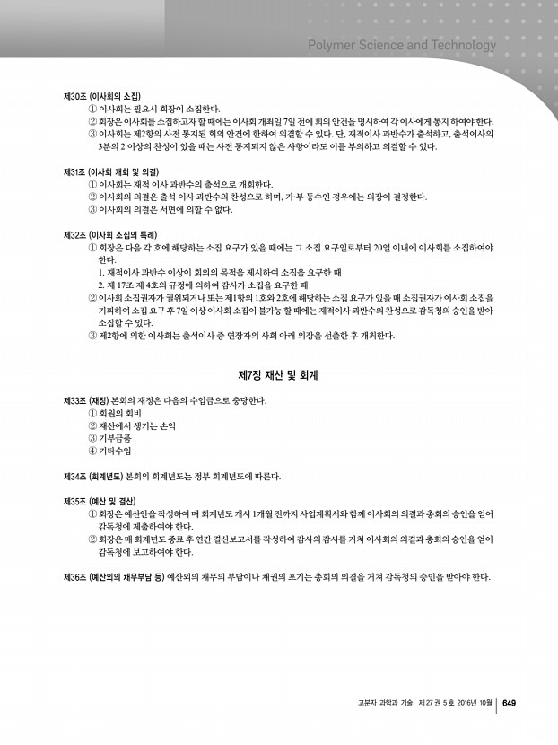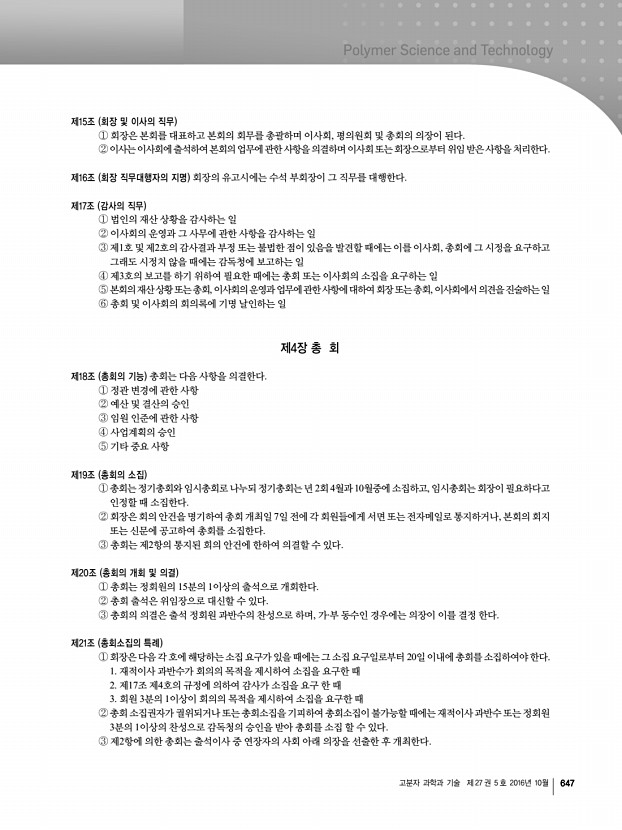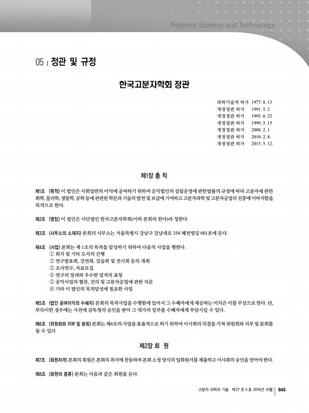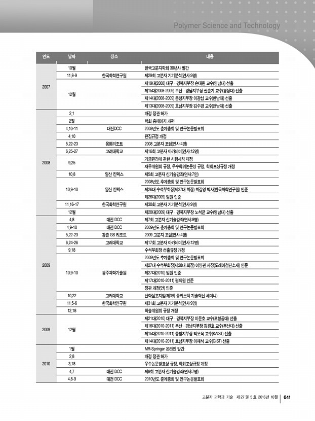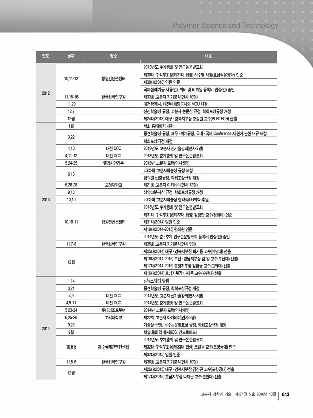 고분자 과학과 기술 제 27 권 5 호 2016년 10월 643 연도 날짜 장소 내용 2012 10.11-12 창원컨벤션센터 2012년도 추계총회 및 연구논문발표회 제30대 수석부회장 제31대 회장 허수영 사장 호남석유화학 인준 제30대 2013 임원 인준 국제협력기금 사용 안 , 회비 및 비회원 등록비 인상 안 승인 11.15-16 한국화학연구원 제33회 고분자 기기분석 연사10명 11.20 대전광역시, 대전마케팅공사와 MOU 체결 12.7 신진학술상 규정, 고분자 논문상 규정, 학회포상규정 개정 12월 제24대 2013 대구 ․ 경북지부장 조길원 교수 POSTECH 선출 2013 1월 학회 홈페이지 개편 3.22 중견학술상 규정, 재무 ․ 회계규정, 국내 ․ 국제 Conference 지원에 관한 내규 제정 학회포상규정 개정 4.10 대전 DCC 2013년도 고분자 신기술강좌 연사7명 4.11-12 대전 DCC 2013년도 춘계총회 및 연구논문발표회 5.24-25 엘리시안강...