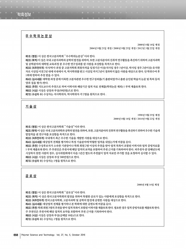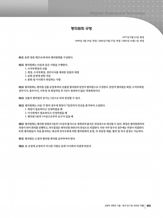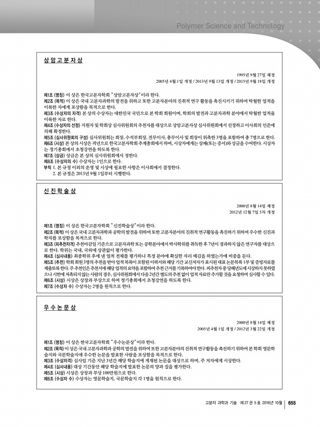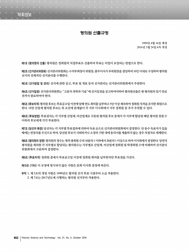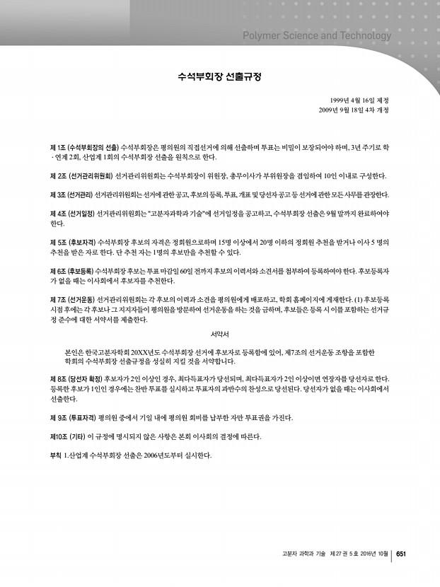 고분자 과학과 기술 제 27 권 5 호 2016년 10월 651 수석부회장 선출규정 1999년 4월 16일 제정 2009년 9월 18일 4차 개정 제 1조 수석부회장의 선출 수석부회장은 평의원의 직접선거에 의해 선출하며 투표는 비밀이 보장되어야 하며, 3년 주기로 학 ․ 연계 2회, 산업계 1회의 수석부회장 선출을 원칙으로 한다. 제 2조 선거관리위원회 선거관리위원회는 수석부회장이 위원장, 총무이사가 부위원장을 겸임하여 10인 이내로 구성한다. 제 3조 선거관리 선거관리위원회는 선거에 관한 공고,후보의 등록,투표,개표 및 당선자 공고 등 선거에 관한 모든 사무를 관장한다. 제 4조 선거일정 선거관리위원회는 고분자과학과 기술에 선거일정을 공고하고, 수석부회장 선출은 9월 말까지 완료하여야 한다. 제 5조 후보자격 수석부회장 후보의 자격은 정회원으로하며 15명 이상에...