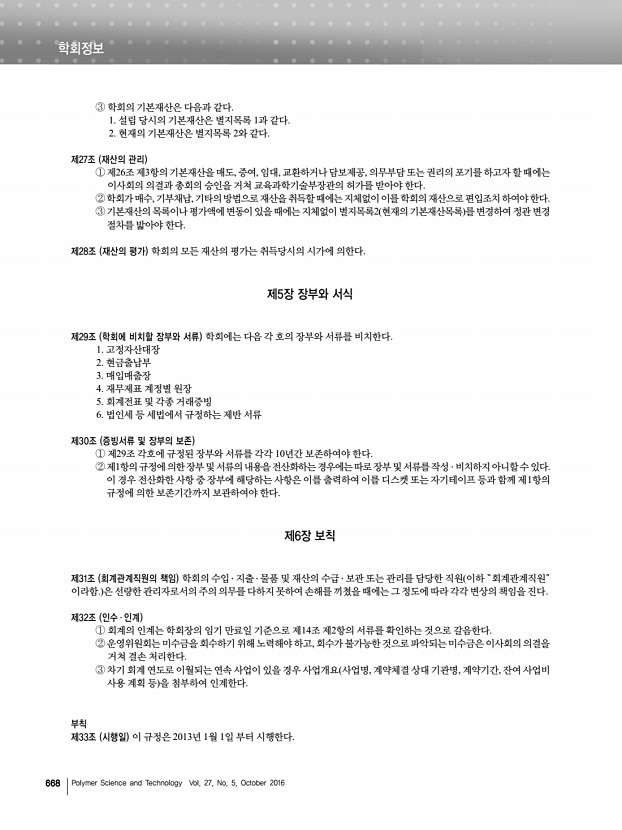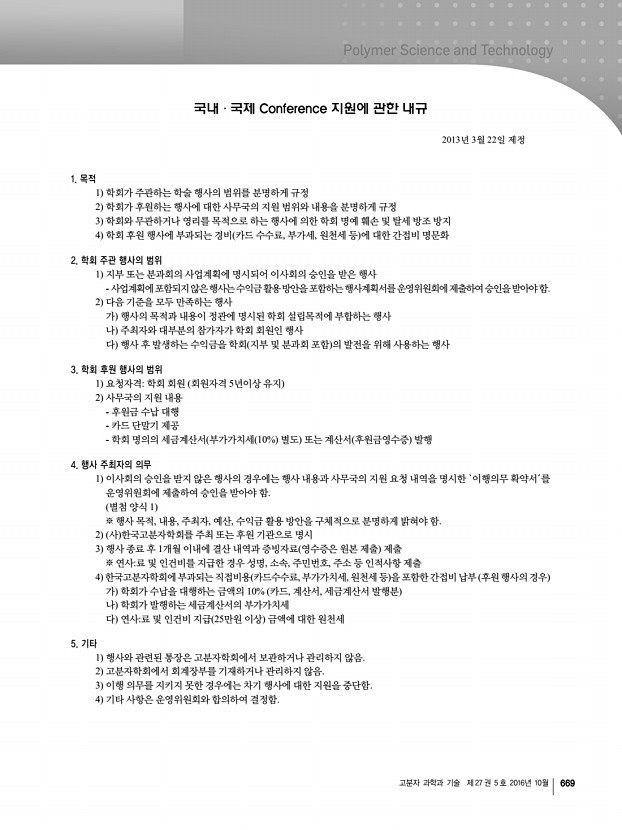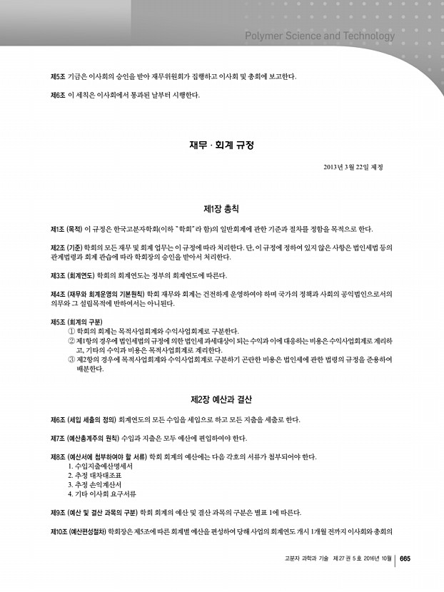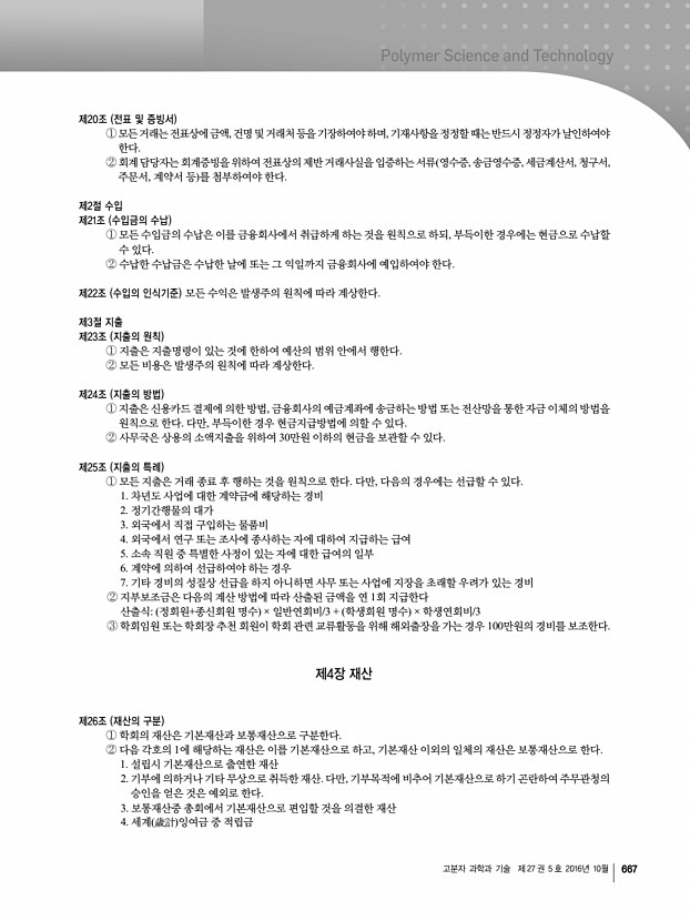 고분자 과학과 기술 제 27 권 5 호 2016년 10월 667 제20조 전표 및 증빙서 ①모든 거래는 전표상에 금액,건명 및 거래처 등을 기장하여야 하며,기재사항을 정정할 때는 반드시 정정자가 날인하여야 한다. ②회계 담당자는 회계증빙을 위하여 전표상의 제반 거래사실을 입증하는 서류 영수증,송금영수증,세금계산서,청구서, 주문서, 계약서 등 를 첨부하여야 한다. 제2절 수입 제21조 수입금의 수납 ①모든 수입금의 수납은 이를 금융회사에서 취급하게 하는 것을 원칙으로 하되, 부득이한 경우에는 현금으로 수납할 수 있다. ② 수납한 수납금은 수납한 날에 또는 그 익일까지 금융회사에 예입하여야 한다. 제22조 수입의 인식기준 모든 수익은 발생주의 원칙에 따라 계상한다. 제3절 지출 제23조 지출의 원칙 ① 지출은 지출명령이 있는 것에 한하여 예산의 범위 ...