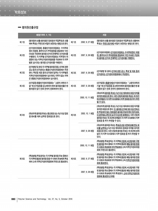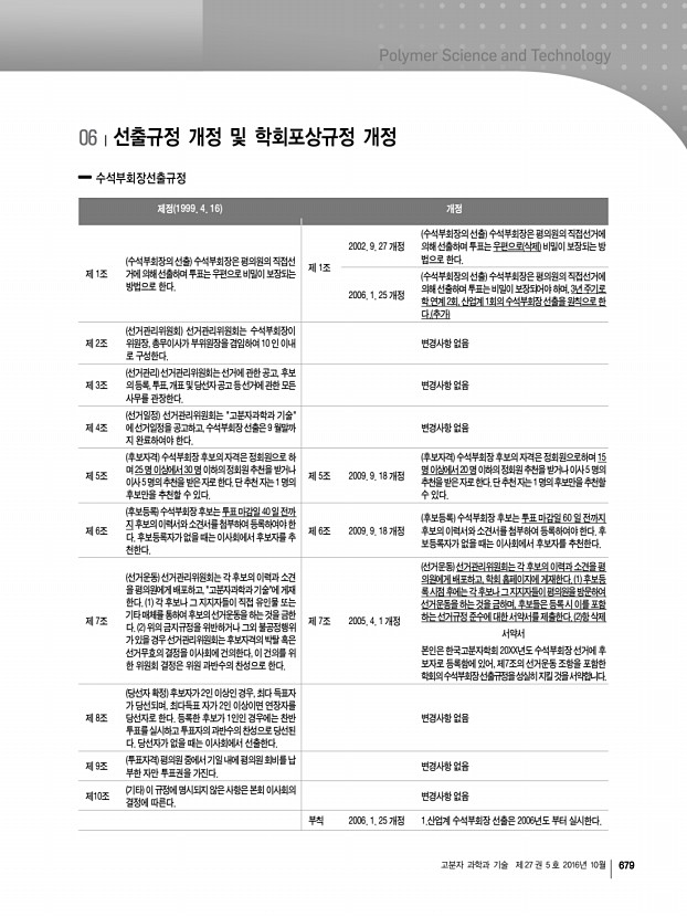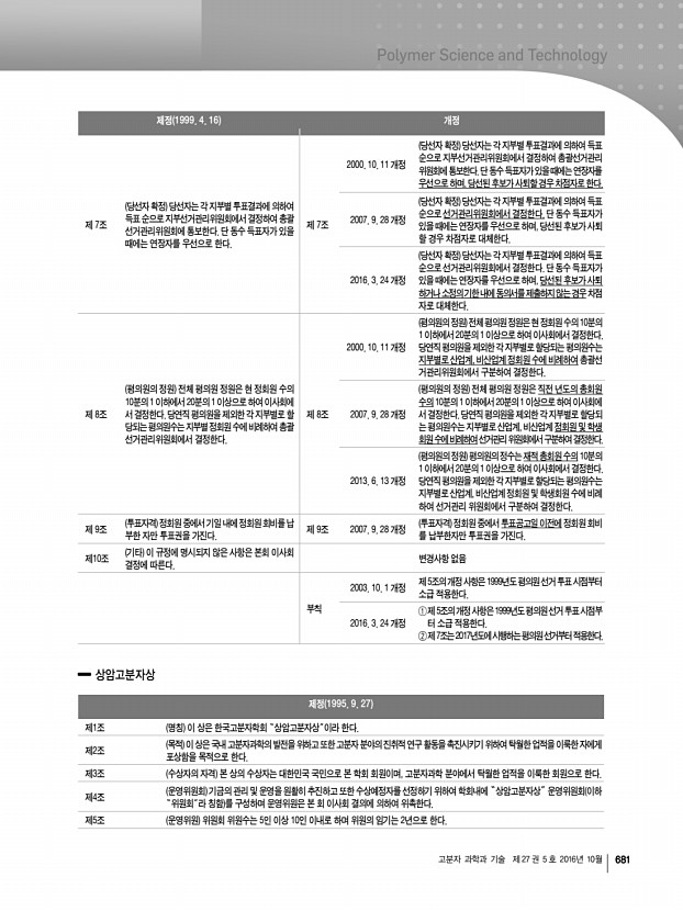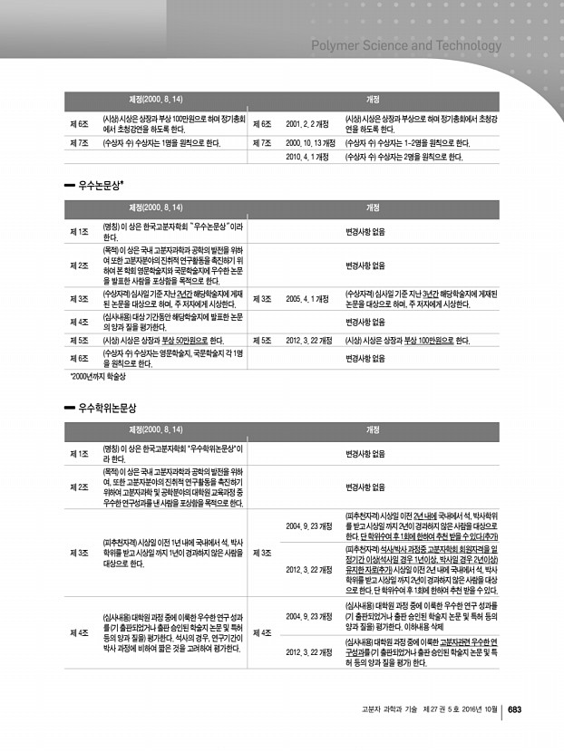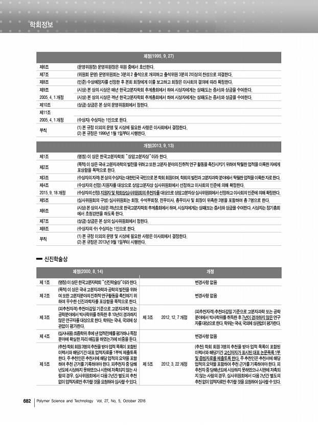 학회정보 682 Polymer Science and Technology Vol. 27, No. 5, October 2016 제정 2000. 8. 14 개정 제 1조 명칭 이 상은 한국고분자학회“신진학술상”이라 한다. 변경사항 없음 제 2조 목적 이 상은 국내 고분자과학과 공학의 발전을 위하 여 또한 고분자분야의 진취적 연구활동을 촉진하기위 하여 우수한 신진과학자를 포상함을 목적으로 한다. 변경사항 없음 제 3조 피추천자격 추천마감일 기준으로 고분자과학 또는 공학분야에서 박사학위를 취득한 후 10년이경과하지 않은 연구자를 대상으로 한다. 학위는 국내, 국외에 상 관없이 평가한다. 제 3조 2012. 12. 7 개정 피추천자격 추천마감일 기준으로 고분자과학 또는 공학 분야에서 박사학위를 취득한 후 7년이 경과하지 않은 연구 자를 대상으로 한다. 학위는 국내, 국외에 상관없이 평가한다. 제 4조 심사내용 최종학위 후에 ...