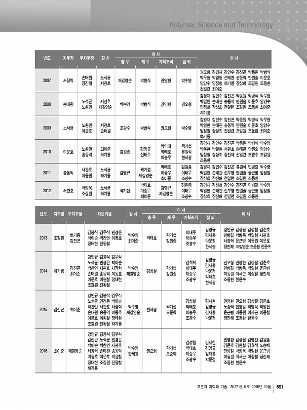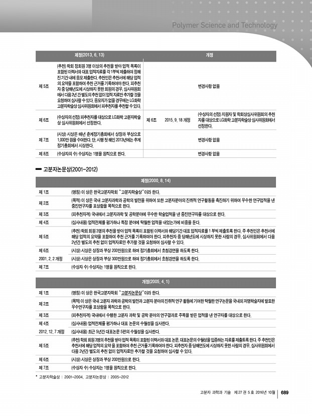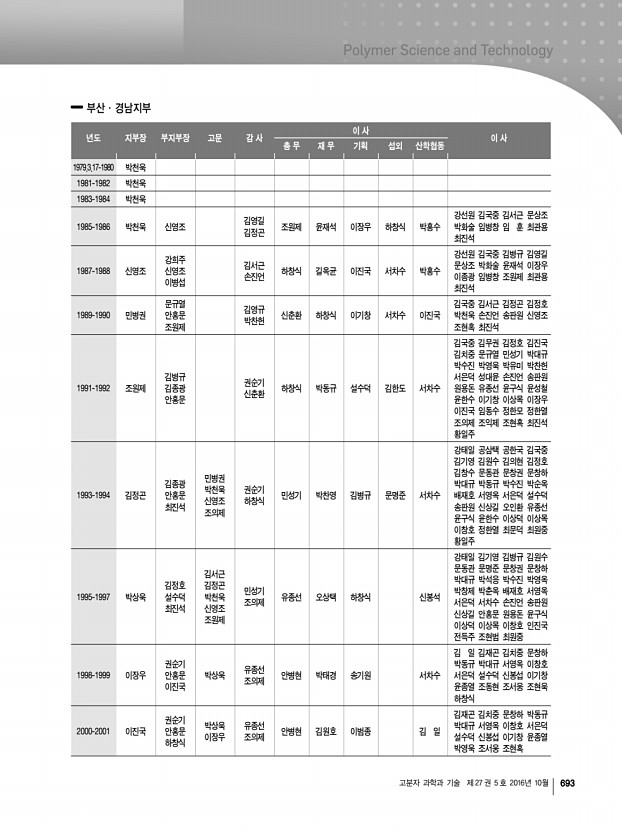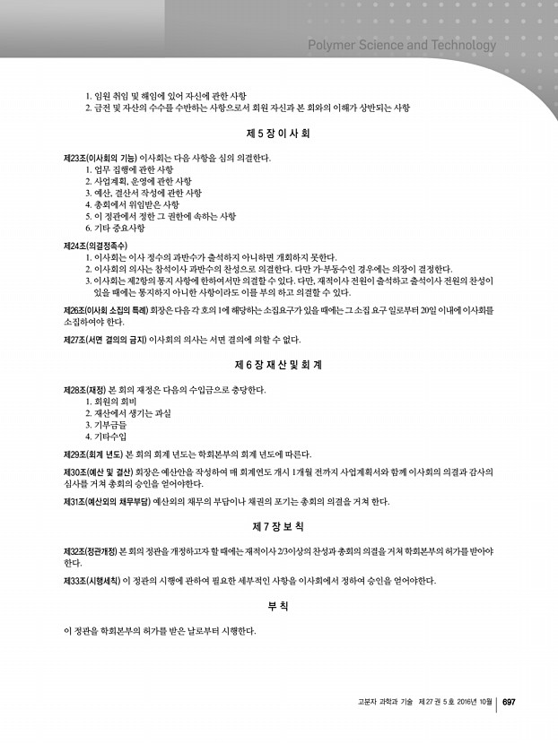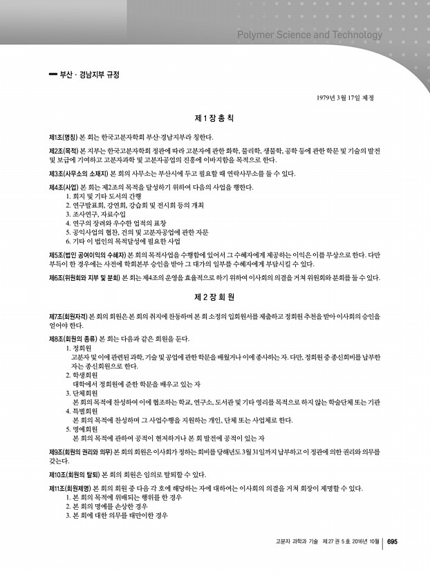 고분자 과학과 기술 제 27 권 5 호 2016년 10월 695 부산·경남지부 규정 1979년 3월 17일 제정 제 1 장 총 칙 제1조 명칭 본 회는 한국고분자학회 부산·경남지부라 칭한다. 제2조 목적 본 지부는 한국고분자학회 정관에 따라 고분자에 관한 화학, 물리학, 생물학, 공학 등에 관한 학문 및 기술의 발전 및 보급에 기여하고 고분자과학 및 고분자공업의 진흥에 이바지함을 목적으로 한다. 제3조 사무소의 소재지 본 회의 사무소는 부산시에 두고 필요할 때 연락사무소를 둘 수 있다. 제4조 사업 본 회는 제2조의 목적을 달성하기 위하여 다음의 사업을 행한다. 1. 회지 및 기타 도서의 간행 2. 연구발표회, 강연회, 강습회 및 전시회 등의 개최 3. 조사연구, 자료수입 4. 연구의 장려와 우수한 업적의 표창 5. 공익사업의 협찬, 건의 및 고분자공업에 관한 자문 6. 기타 이 법인...
