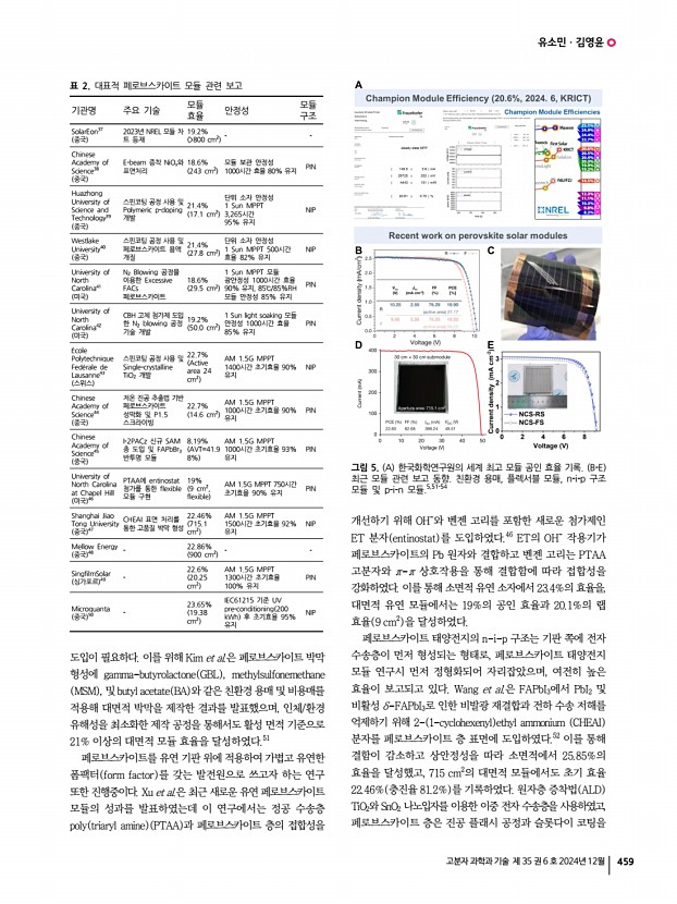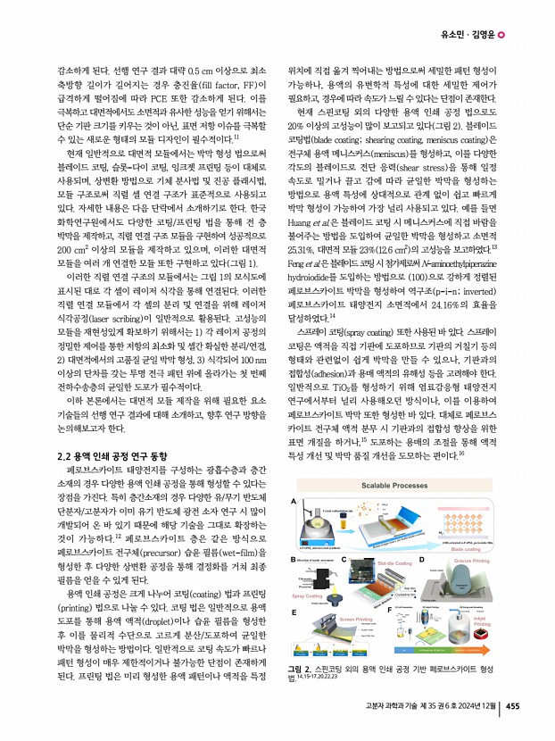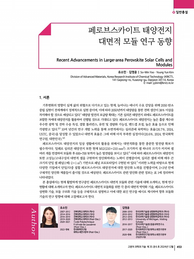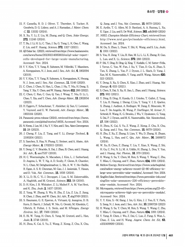유소민ㆍ김영윤 고분자 과학과 기술 제 35 권 6 호 2024년 12월 461 15. F. Cassella, R. D. J. Oliver, T. Thornber, S. Tucker, R. Goodwin, D. G. Lidzey, and A. J. Ramadan, J. Mater. Chem. C, 12, 13332 2024 16. X. Xu, Y. Li, Z. Liu, M. Zhang, and Q. Chen, Solar Energy, 272, 11246 2024 17. T. Bu, J. Li, H. Li, C. Tian, J. Su, G. Tong, L. K. Ono, C. Wang, Z. Lin, and F. Huang, Science, 372, 1327 2021 18. QD Solar lnc. 2023 , retrieved from https//www.businesswire. com/news/home/20230214005803/en/qd-solar-reportcells-developed-for-large-scale-manufacturing, AccessedNov. 2024. 19. Y. Y. Kim, T. Y. Yang, R. Suhonen, M. V lim ki, T. Maaninen, A. Kemppainen, N. J. Jeon, and J. Seo, Adv. Sci., 6, 1802094 2019 20. Y. Y. Kim, T. Y. Yang, R. Suhonen, A. Kemppainen, K. Hwang, N. J. Jeon, and J. Seo, Nat. Commun., 11, 5146 2020 21. C. Chen, J. Chen, H. Han, L. Chao, J. Hu, T. Niu, H. Dong, S. Yang, Y. Xia, Y. Chen, and W. Huang, Nature, 612, 266 2022 22. C. Chen, C. Ran, C. Guo, Q. Ya...