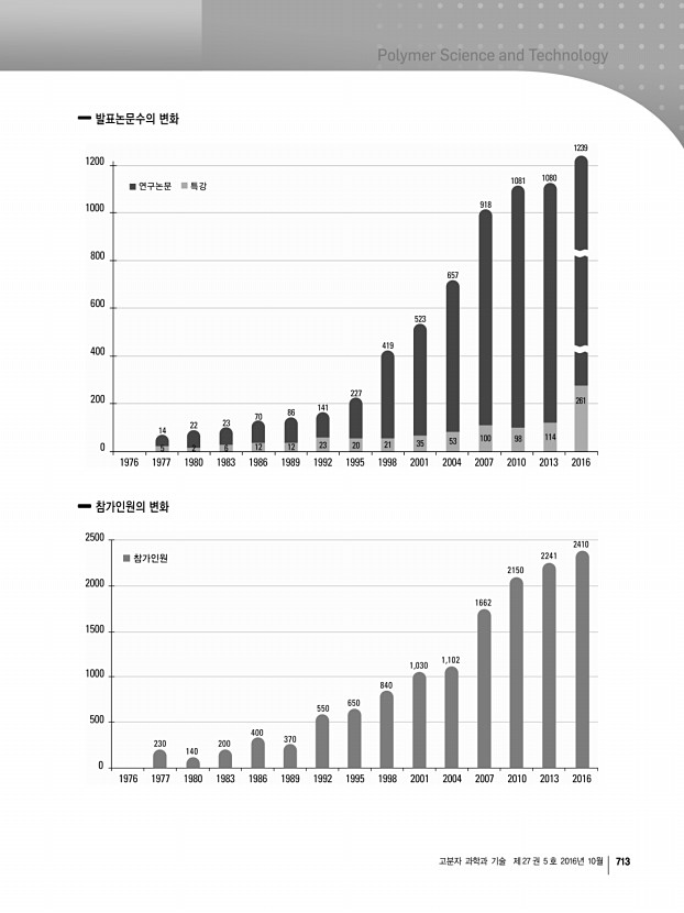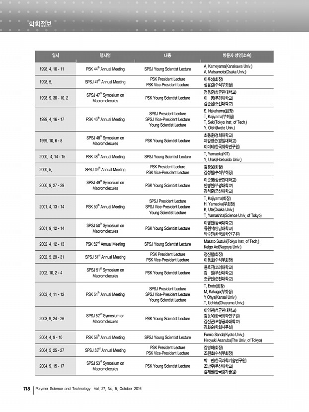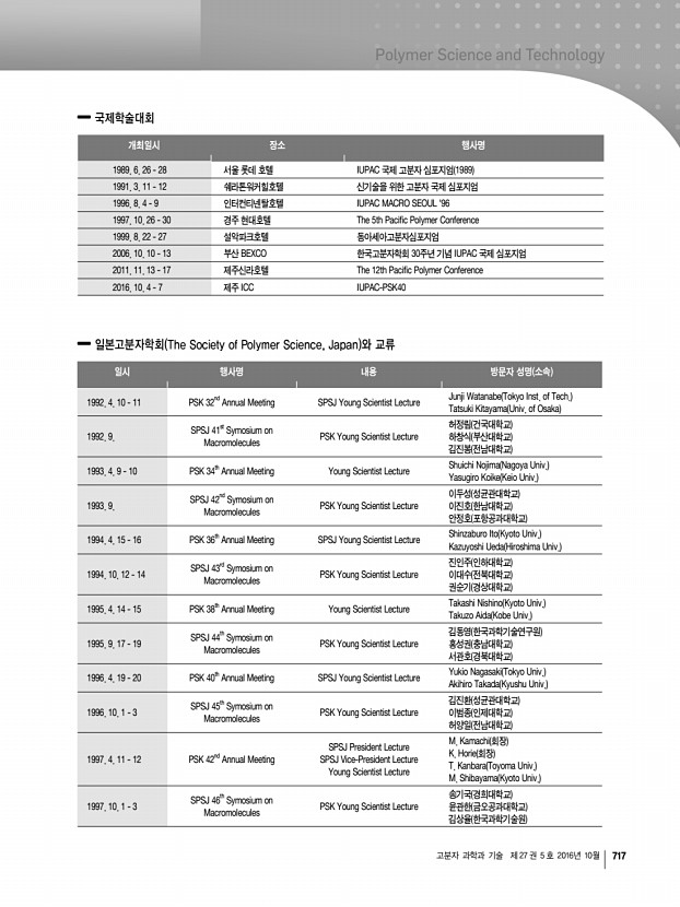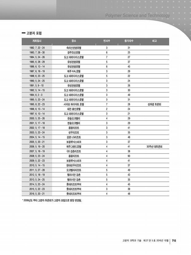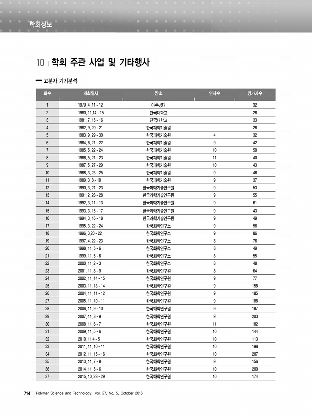 학회정보 714 Polymer Science and Technology Vol. 27, No. 5, October 2016 10╷학회 주관 사업 및 기타행사 고분자 기기분석 회수 개최일시 장소 연사수 참가자수 1 1979. 4. 11 12 아주공대 32 2 1980. 11.14 15 단국대학교 28 3 1981. 7. 15 16 단국대학교 33 4 1982. 9. 20 21 한국과학기술원 28 5 1983. 9. 29 30 한국과학기술원 4 32 6 1984. 6. 21 22 한국과학기술원 9 42 7 1985. 5. 22 24 한국과학기술원 10 50 8 1986. 5. 21 23 한국과학기술원 11 40 9 1987. 5. 27 29 한국과학기술원 10 43 10 1988. 3. 23 25 한국과학기술원 9 46 11 1989. 3. 8 10 한국과학기술원 9 37 12 1990. 3. 21 23 한국과학기술연구원 9 53 13 1991. 2. 26 28 한국과학기술연구원 9 55 14 1992. 3. 11 13 한국과학기술연구원 9 61 15 1993. 3. 15 17 한국과학기술연구원 9 43 16 1994. 3. 16 18 한국과학기술연구원 9 49 17 1995. 3. 22 24 한국화학연구소 9 56 18 1996. 3.20 22 한국화학연구소 9 86 19 1...