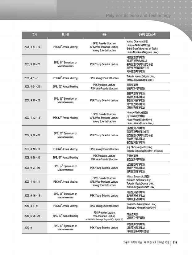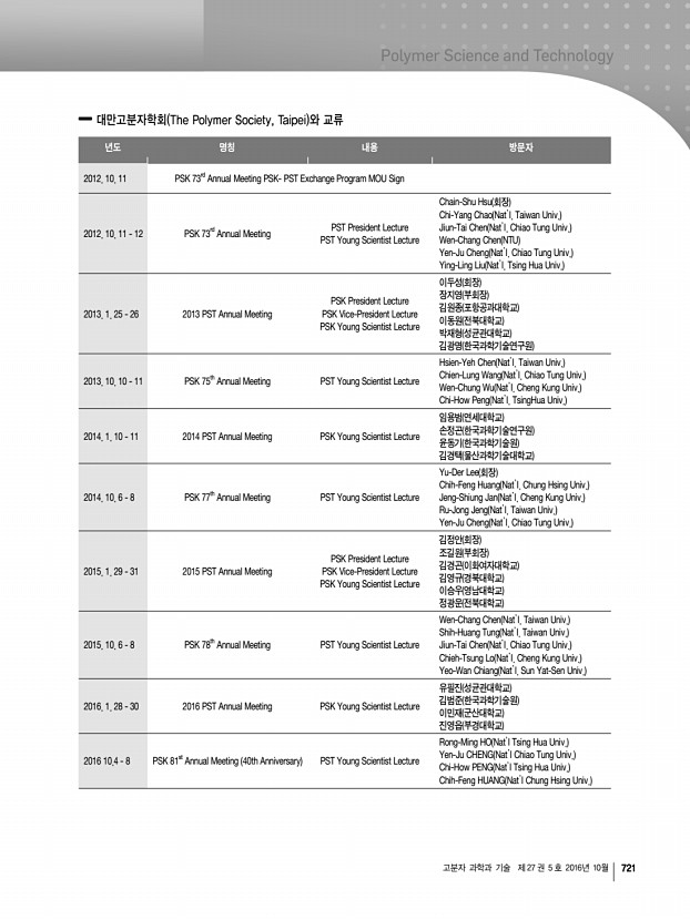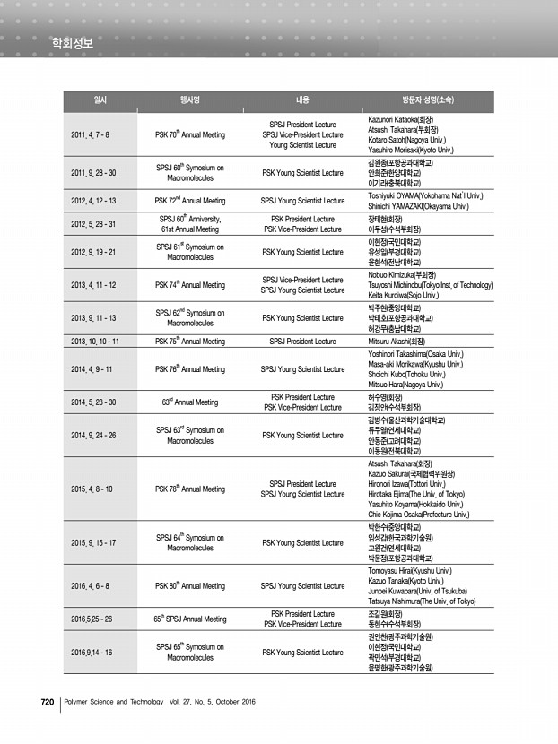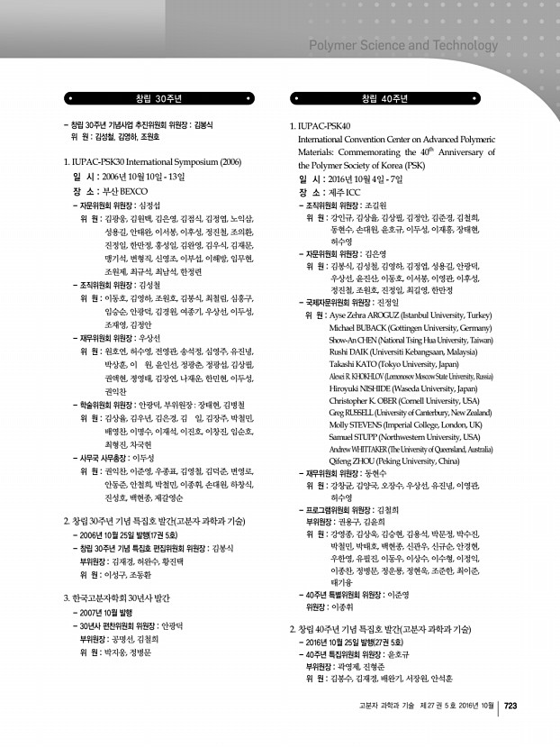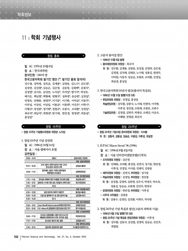 학회정보 722 Polymer Science and Technology Vol. 27, No. 5, October 2016 11╷학회 기념행사 창립 총회 일 시 1976년 10월 8일 장 소 한국과학원 참석인원 180여 명 한국고분자학회 발기인 명단 *발기인 총회 참석자 강수철, 강박광, 길옥균, 김계용*, 김광웅, 김노수*, 김도양*, 김성연, 김성철*,김승곤, 김은영, 김웅창, 김원택*, 김점식*, 김정엽*,김지호, 남상빈, 노익삼*, 마석일*,맹기석*, 박상호, 배기은, 백남철*,백형배, 변형직*, 성좌경*, 송승헌*, 심정섭*, 안영옥, 안태완, 원영무*,이기동*, 이기화, 이덕균*, 이동주*, 이부섭, 이상민, 이상일, 이용균*, 이종희*, 이진우*, 이학기*, 이형규*,장성봉*,정기현*,정철규*, 조봉식, 조의환*, 진정일*, 최규석*,최남석*,최병권*,한기태, 한만정, 한정련*, 허동섭*, 홍성일* 창립 10주년 창립 10주년 기념행사위원회 위원장노익삼 1. 창립 10주년 ...