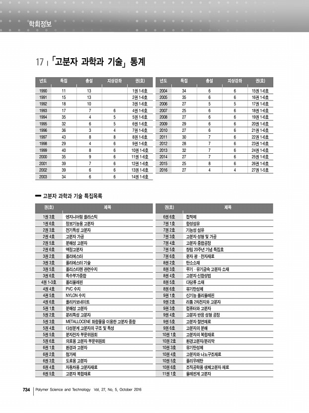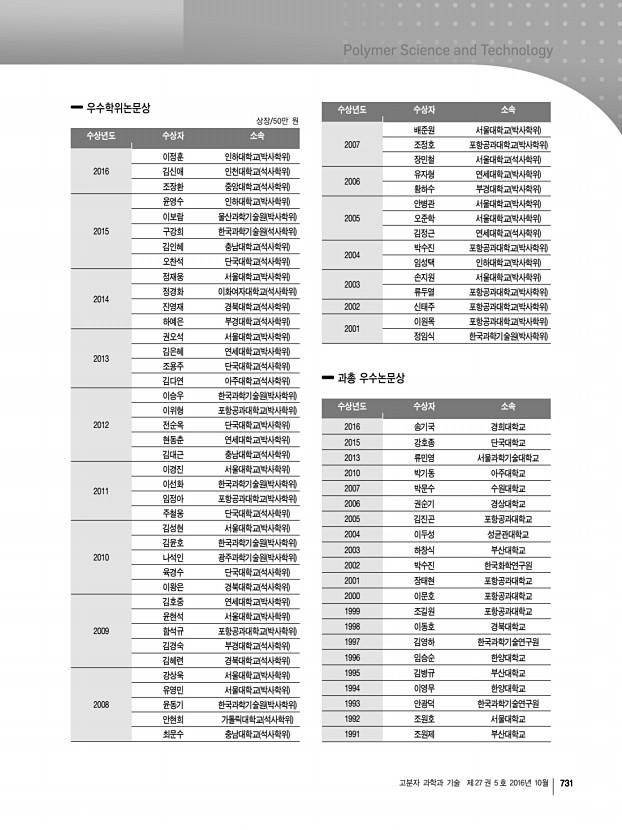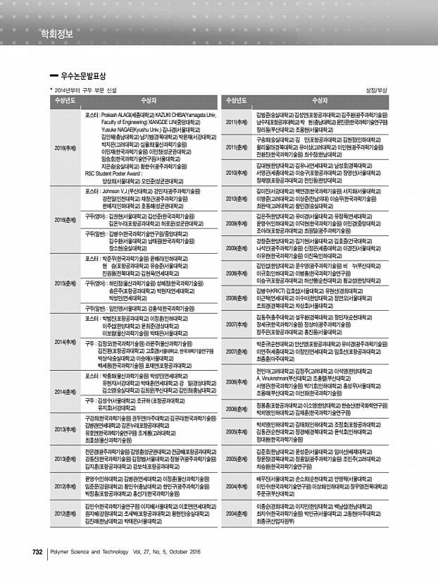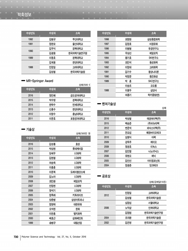 학회정보 730 Polymer Science and Technology Vol. 27, No. 5, October 2016 수상년도 수상자 소속 1992 김병규 부산대학교 1991 정한모 울산대학교 1990 김우식 경북대학교 김광웅 한국과학기술연구원 1989 이동호 경북대학교 1988 김계용 한양대학교 진정일 고려대학교 김성철 한국과학기술원 수상년도 수상자 소속 2016 김성룡 효성 2015 박상현 롯데케미칼 2014 양세우 LG화학 2013 김현철 LG화학 2012 여승욱 LG화학 2011 이충훈 LG화학 2010 이문복 도레이첨단소재 2009 김노마 LG화학 2008 최진환 제일모직 2007 안정헌 LG화학 2006 장석기 LG화학 2005 정특래 키토라이프 2004 양춘병 삼성아토피나 2003 정영태 대한유화 2002 오석헌 한화 2001 이찬홍 엘지화학 2000 배효근 삼화페인트 1999 송병규 대림산업 수상년도 수상자 소속 1998 최창현 삼성종합화학 1997 김정호 미원유화 1996 이병형 유공연구소 1...
