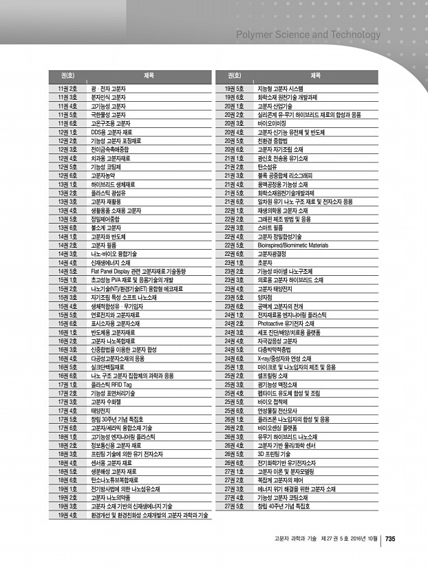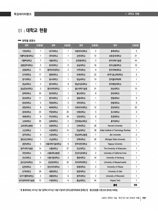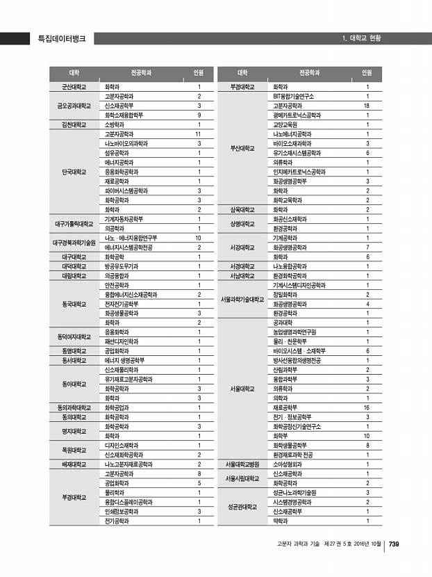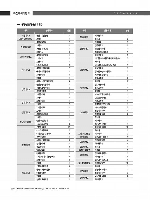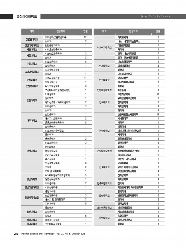 738 Polymer Science and Technology Vol. 27, No. 5, October 2016 대학 전공학과 인원 가천대학교 패션디자인전공 1 가톨릭관동대학교 의학과 1 가톨릭대학교 생명공학전공 2 약학과 1 의생명과학교실 1 화학전공 3 강릉원주대학교 생명화학공학과 1 치의예과 1 강원대학교 교양학부 1 나노응용공학과 2 생물의소재공학과 2 에너지화학공학과 1 화학공학과 4 화학과 1 건국대학교 유기나노시스템공학과 4 융합생명특성학과 1 융합신소재공학과 5 의생명화학과 1 화학공학과 2 화학과 4 경기대학교 화학공학과 1 화학과 2 경남대학교 기계공학부 1 도서관 1 소방방재공학과 1 화학과 1 경남정보대학교 신발패션산업과 1 신소재화공계열 2 경북대학교 고분자공학과 12 나노소재공학부 2 바이오섬유소재학과 3 섬유공학전공 1 섬유시스템공학과 3 염색공학과 1 응용화학과 3 임산공학...