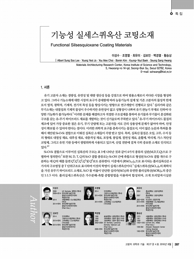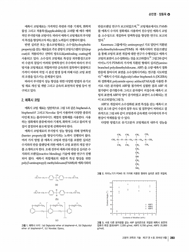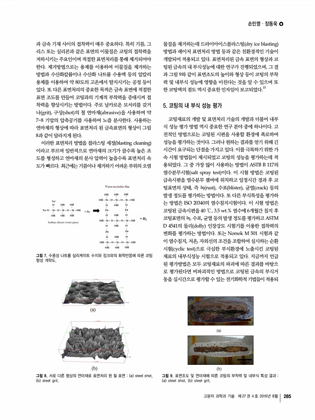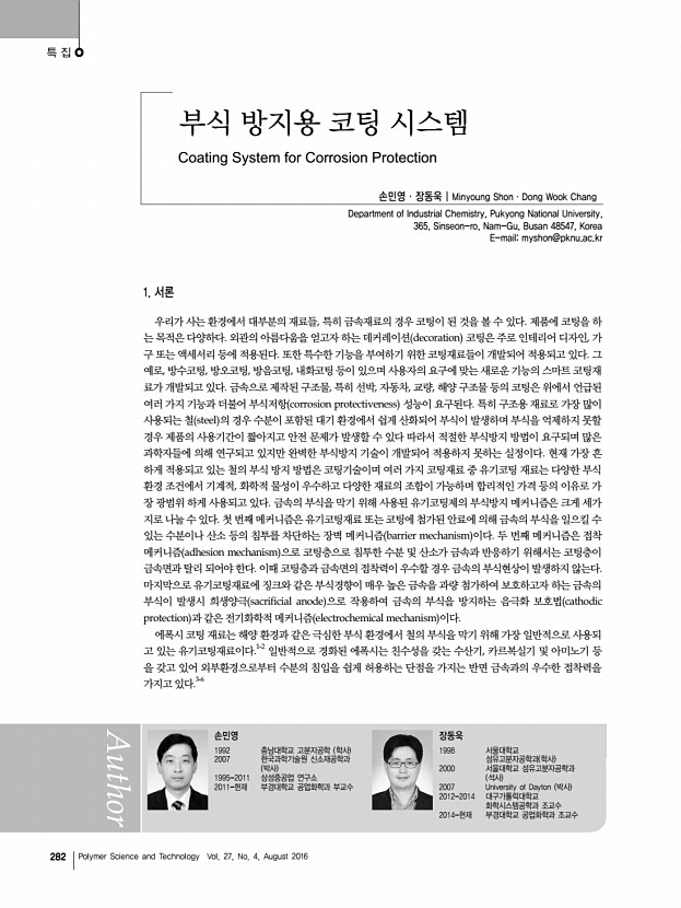 특 집 282 Polymer Science and Technology Vol. 27, No. 4, August 2016 부식 방지용 코팅 시스템 Coating System for Corrosion Protection 손민영ㆍ장동욱 | Minyoung ShonㆍDong Wook Chang Department of Industrial Chemistry, Pukyong National University, 365, Sinseon-ro, Nam-Gu, Busan 48547, Korea E-mailmyshon@pknu.ac.kr 손민영 1992 충남대학교 고분자공학 학사 2007 한국과학기술원 신소재공학과 박사 1995-2011 삼성중공업 연구소 2011-현재 부경대학교 공업화학과 부교수 장동욱 1998 서울대학교 섬유고분자공학과 학사 2000 서울대학교 섬유고분자공학과 석사 2007 University of Dayton 박사 2012-2014 대구가톨릭대학교 화학시스템공학과 조교수 2014-현재 부경대학교 공업화학과 조교수 1. 서론 우리가 사는 환경에서 대부분의 재료들, 특히 금속재료의 경우 코팅이 된 것을 볼 수 있다. 제품에 코팅을 하 는 목적은 다양하다. 외관의 아...