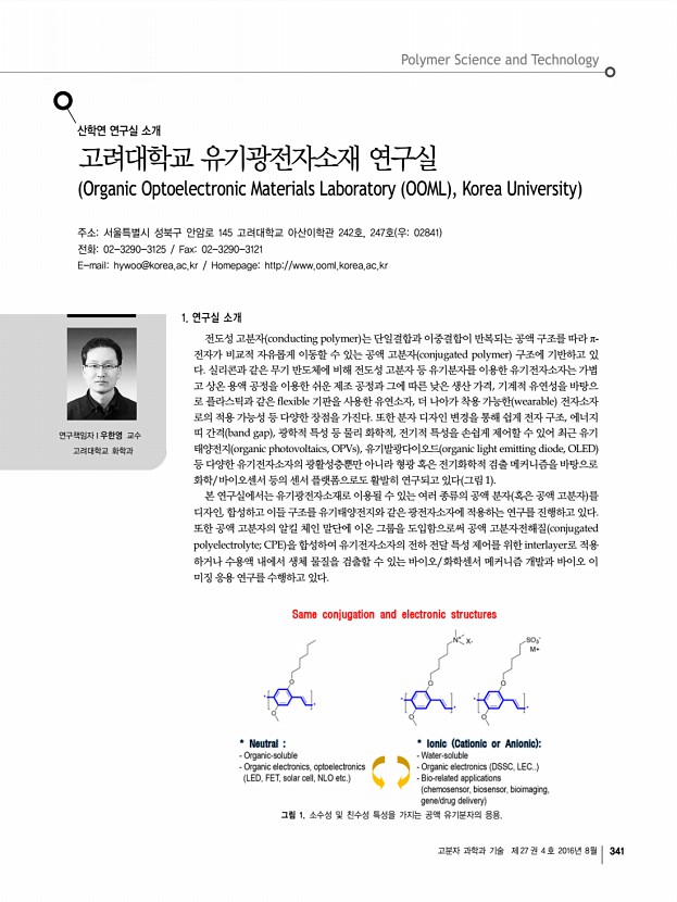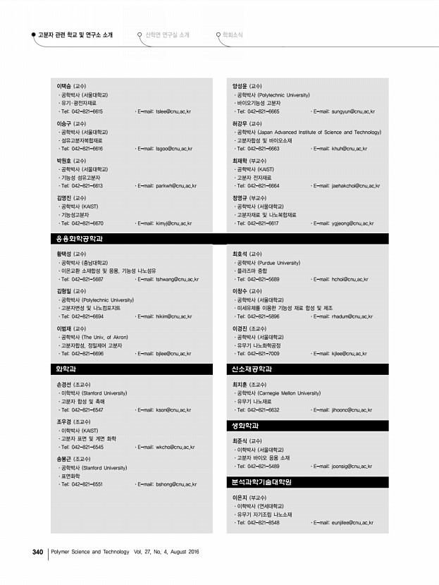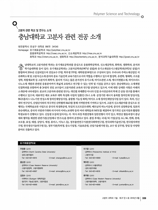 고분자 과학과 기술 제 27 권 4 호 2016년 8월 339 충 고분자 관련 학교 및 연구소 소개 충남대학교 고분자 관련 전공 소개 대전광역시 유성구 대학로 99 우34134 Homepage유기재료공학과 http//polyfiber.cnu.ac.kr 응용화학공학과 http//ceac.cnu.ac.kr, 신소재공학과 http//mse.cnu.ac.kr 화학과 http//chem.cnu.ac.kr, 생화학과 http//biochemistry.cnu.ac.kr, 분석과학기술대학원 http//grast.cnu.ac.kr 남대학교의 고분자관련 학과는 유기재료공학과를 중심으로 응용화학공학과, 신소재공학과, 화학과, 생화학과, 분석과 학기술대학원 등이 있다. 유기재료공학과는 고분자공학과 1987년 설립 와 유기소재섬유시스템공학과 1952년 설립 가 통합하여 2016년 신설되었으며 전임교수 15명, 학부생 370명, 대학원생 88명으로 구성되어 있다. 우리나라 주력소재산업인 석 유화학소재 및 고분자신소재 분야의 중요 ...