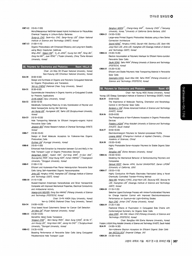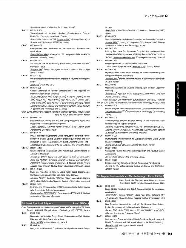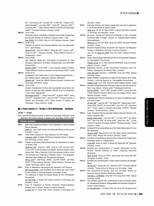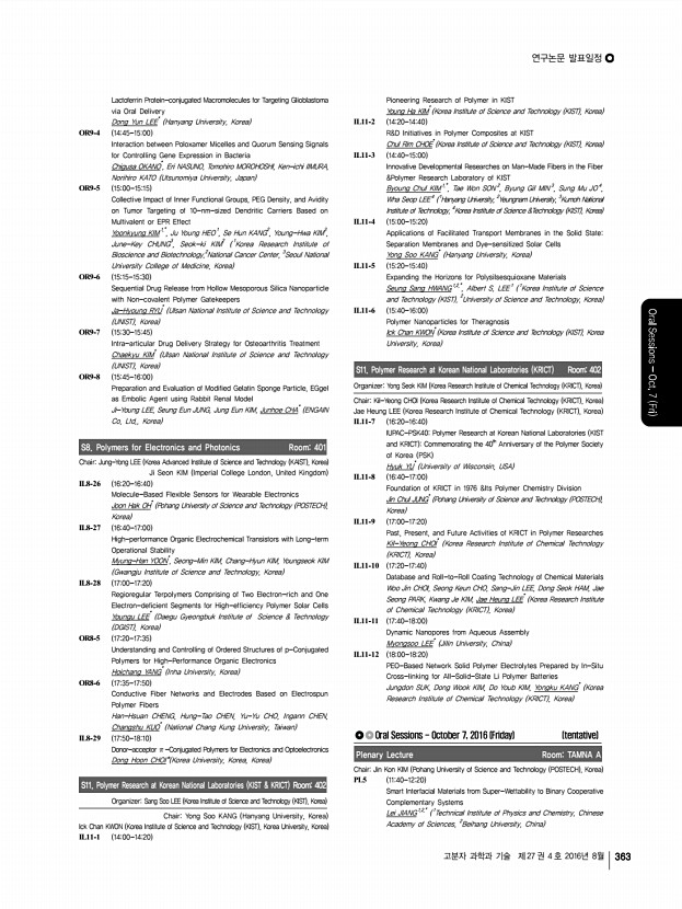 연구논문 발표일정 고분자 과학과 기술 제 27 권 4 호 2016년 8월 369 GO1 , Hye-kyeong LEE1 , Lee Seon IK2 , In-Hae KIM1 , Chaekyu KIM1 , Sung Cheol BAE1,* , Hyun Woo RHEE1,* , Eunji LEE2,* , Sang-Kyu KWAK1,* , Ja Hyoung RYU1,* 1 Ulsan National Institute of Science and Technology UNIST , 2 Chungnam National University, Korea OR9-20 1415-1430 Colorimetric Contact Lens Sensor Containing Cerium Oxide Nanoparticles and Glucose Oxidase for Monitoring Glucose Levels in Tear Woo Ri BAE, Si Jin PARK, Dong Yun LEE* Hanyang University, Korea OR9-21 1430-1445 Treatment of High-fat Diet-induced Diabetes using Oral Absorbable GLP-1 Gene Therapy Seung Ah LEE1 , Yong Hwa HWANG1 , Chang Woo LEE1 , Yong-kyu LEE2,*, Dong Yun LEE1,* 1 Hanyang University, 2 Korea National University of Transportation, Korea OR9-22 1445-1500 High Molecular Weight Bio Furan-based Co-polyesters for Food Packaging ApplicationsSynthesis, Characterization and Solid-state Polymerization Sungmin HONG1,2 , O Ok PA...