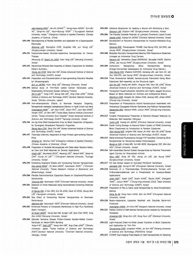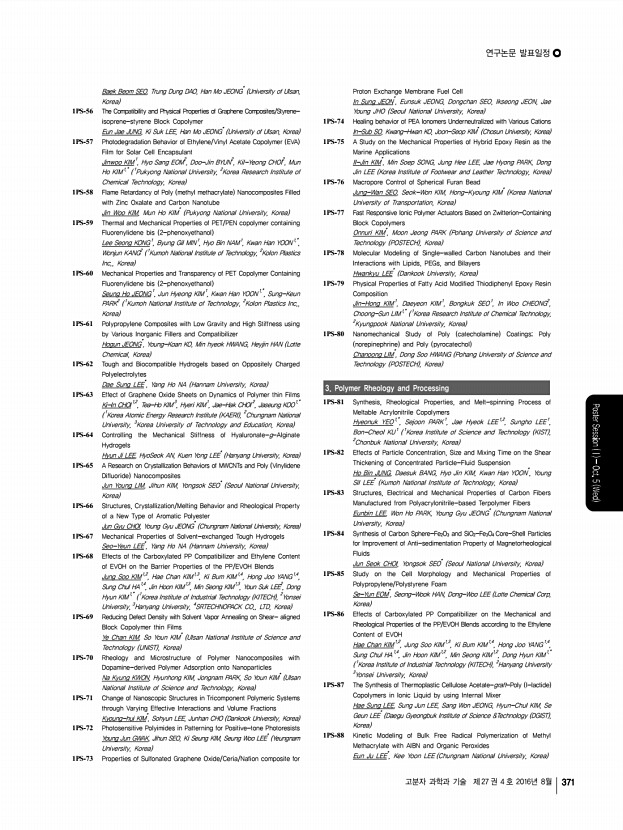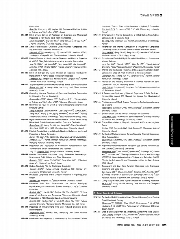 연구논문 발표일정 고분자 과학과 기술 제 27 권 4 호 2016년 8월 373 Composites Seho KIM, Yoon-jeong KIM, Yanghee KIM, Seokhoon AHN* Korea Institute of Science and Technology KIST , Korea 1PS-123 Effect of Low Content of Plasticizer on Expansion and Mechanical Properties of Poly lactic acid Foam Composites Heun-Young SEO1 , Yong-Sik YOEM1 , Sang-Lak LEE2 , Ho-Gyu YOON1,* 1 Korea University, 2 Dukyang Industry, Korea 1PS-124 Amine-Functionalized Graphene Oxide/Polyimide Composites with Adjusted Glass Transition Temperature Keuk-Min JEONG, Nam-Kyoung LEE, Hyeok-Gi LEE, Jae-Hoon JEONG, Yu Heng LI, Chang-Sik HA* Pusan National University, Korea 1PS-125 Effects of Surface Modification on the Dispersion and Electrical Properties of MWCNT Filled Poly ethylene-co-ethyl acrylate Composites Yong Sik YEOM1,* , Kie Yong CHO1 , Heun Young SEO1 , Jae Young LEE1 , Hee Chul KANG2 , Ho Gyu YOON1,* 1 Korea University, 2 Kyungwon New Materials, Inc., Korea 1PS-126 Effect of Sol-gel ZnO ...