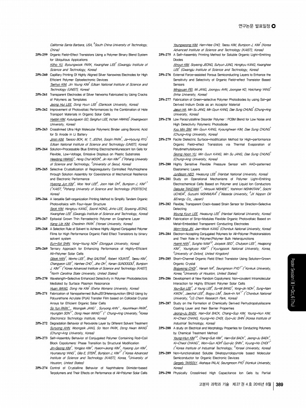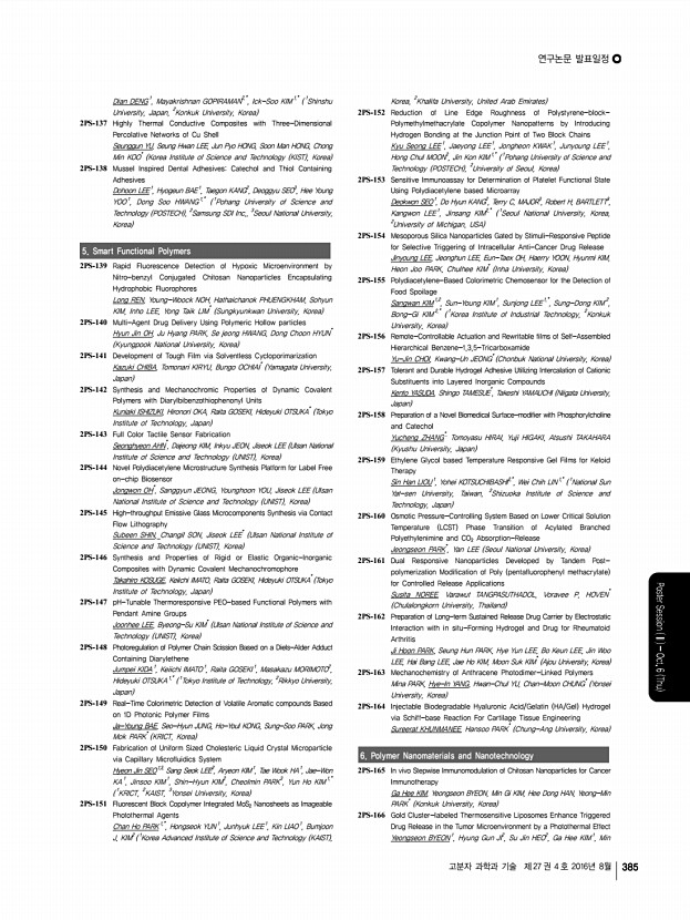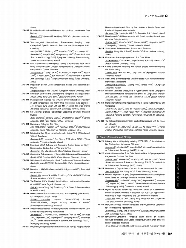 연구논문 발표일정 고분자 과학과 기술 제 27 권 4 호 2016년 8월 387 Korea 2PS-195 Biostable Gold-Crosslinked Polymeric Nanoparticles for Anticancer Drug Delivery Sangmin JEON, Hyewon KO, Jae Hyung PARK* Sungkyunkwan University, Korea 2PS-196 Tumor-targeted Near-Infrared Fluorescence Imaging Using Cathepsin-B Specific Metabolic Precursor and Bioorthogonal Click Chemistry Man Kyu SHIM1,2 , Ho Kyung KO1,4 , Yongwhan CHOI1,3, Mun Kyeong JO1,2 , Jooho PARK1 , Jong-Ho KIM2 , Kwangmeyung KIM1,* 1 Korea Institute of Science and Technology KIST , 2Kyung Hee University, 3Korea University, 4 Seoul National University, Korea 2PS-197 RNAi Therapy with Tumor-targeted Delivery of Polymerized VEGF siRNA using Thiolated Glycol Chitosan Nanoparticles to Overcome Avastin Resistance in Cancer Treatment Myung Goo KIM1,2, Sung Duk JO1, So Jin LEE1, Gi Jung KWAK1,3, Hyosuk KIM1,3 , Ji Hoon JEONG2 , Sun Hwa KIM1,* 1 Korea Institute of Science and Technology KIST , 2 Sungkyunkwan University,...