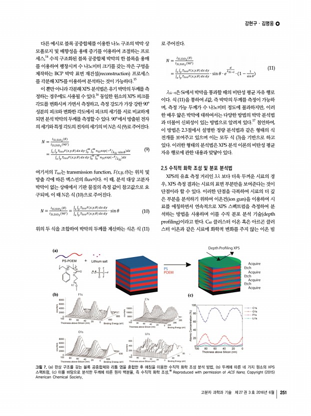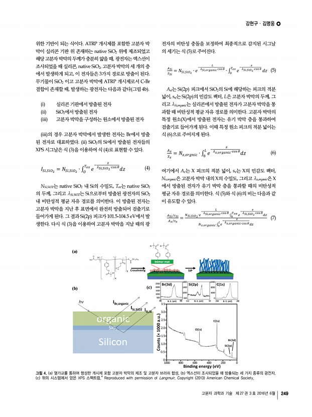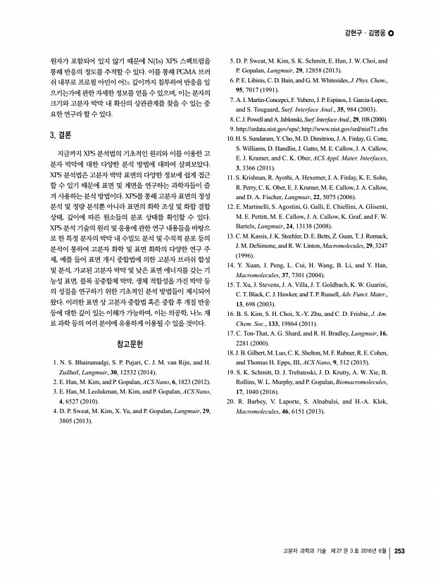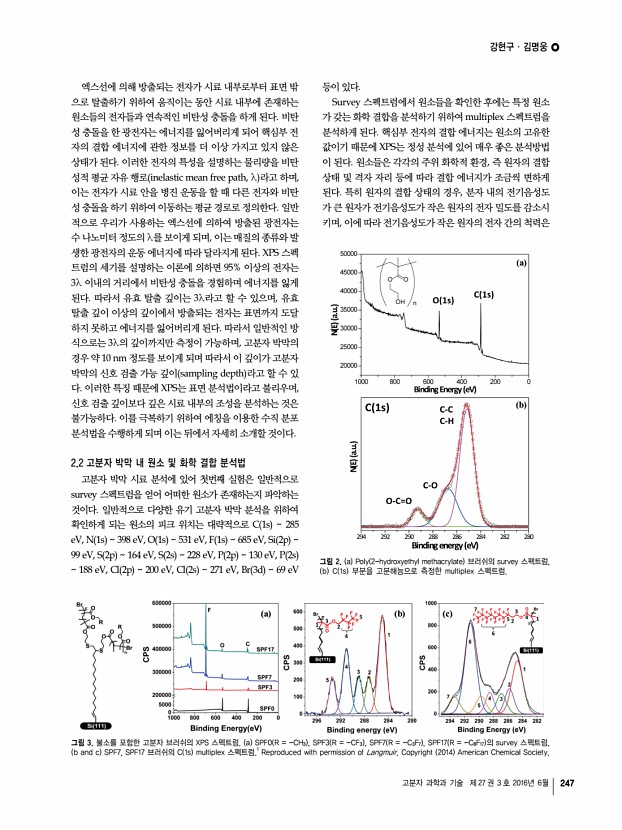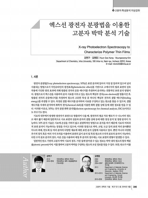 고분자 특성분석 지상강좌 고분자 과학과 기술 제 27 권 3 호 2016년 6월 245 강현구 2016 인하대학교 화학과 학사 2016-현재 인하대학교 화학․ 화공융합학과 석사과정 김명웅 2002 한양대학교 화학과 학사 2004 한양대학교 화학과 석사 2004-2007 금호석유화학 전자화학연구소 연구원 2013 Department of Materials Science and Engineering, University of Wisconsin, Madison 박사 2013-2015 Department of Materials Science and Engineering, Cornell University 박사후 연구원 2015-현재 인하대학교 화학과 조교수 엑스선 광전자 분광법을 이용한 고분자 박막 분석 기술 X-ray Photoelectron Spectroscopy to Characterize Polymer Thin Films 강현구ㆍ김명웅 | Hyun Goo KangㆍMyungwoong Kim Department of Chemistry, Inha University, 100 Inha-ro, Nam-gu, Incheon 22212, Korea E-mailmkim233@inha.ac.kr 1. 서론 광전자 분광법 X-ray photoelectron spectroscopy, XPS 은 표면 분석에 있...