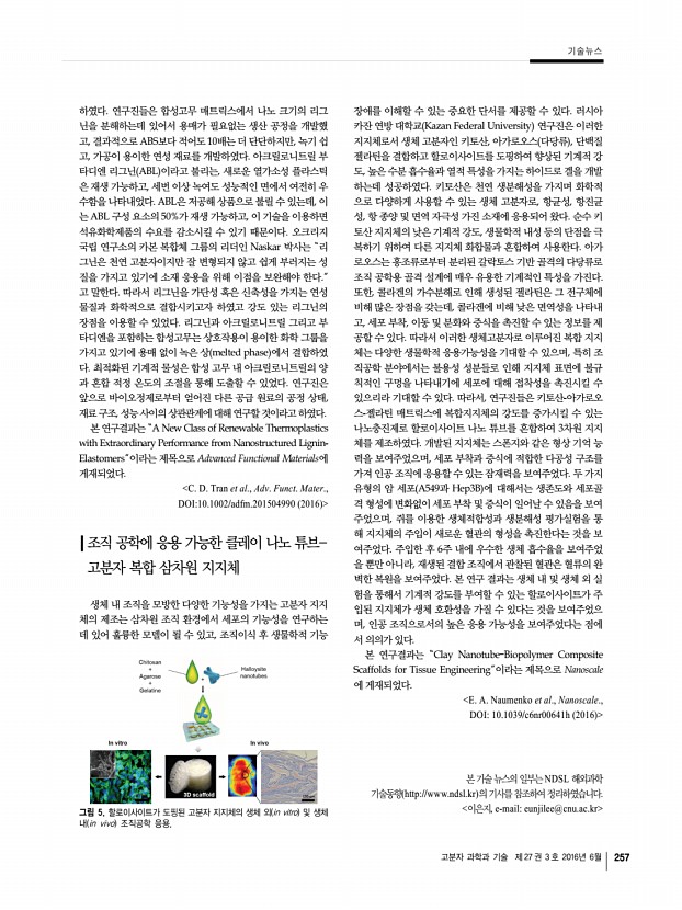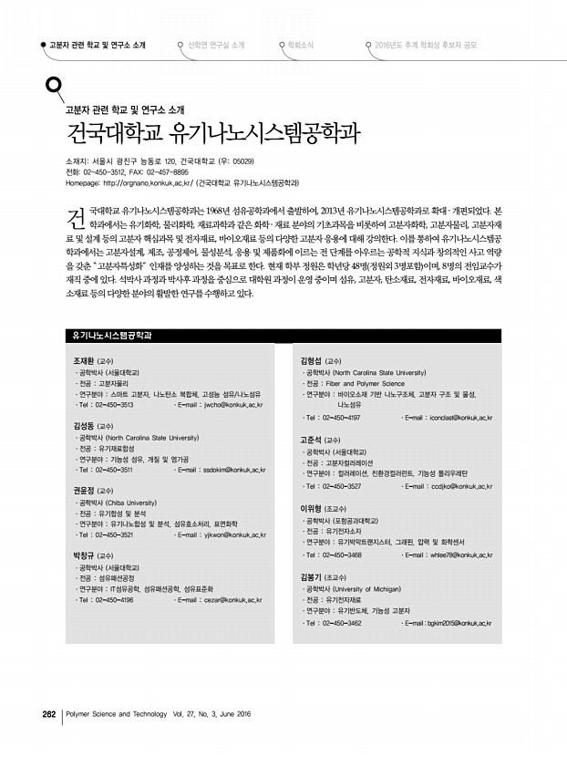 ...16 건 고분자 관련 학교 및 연구소 소개 건국대학교 유기나노시스템공학과 소재지서울시 광진구 능동로 120, 건국대학교 우05029 전화02-450-3512, FAX02-457-8895 Homepagehttp//orgnano.konkuk.ac.kr/ 건국대학교 유기나노시스템공학과 국대학교 유기나노시스템공학과는 1968년 섬유공학과에서 출발하여, 2013년 유기나노시스템공학과로 확대 ‧ 개편되었다. 본 학과에서는 유기화학, 물리화학, 재료과학과 같은 화학 ‧ 재료 분야의 기초과목을 비롯하여 고분자화학, 고분자물리, 고분자재 료 및 설계 등의 고분자 핵심과목 및 전자재료, 바이오재료 등의 다양한 고분자 응용에 대해 강의한다. 이를 통하여 유기나노시스템공 학과에서는 고분자설계, 제조, 공정제어, 물성분석, 응용 및 제품화에 이르는 전 단계를 아우르는 공학적 지식과 창의적인 사고 역량 을 갖춘“고분자...