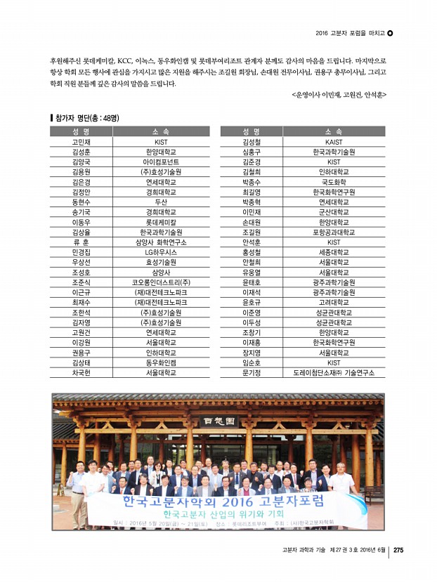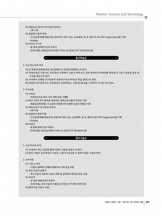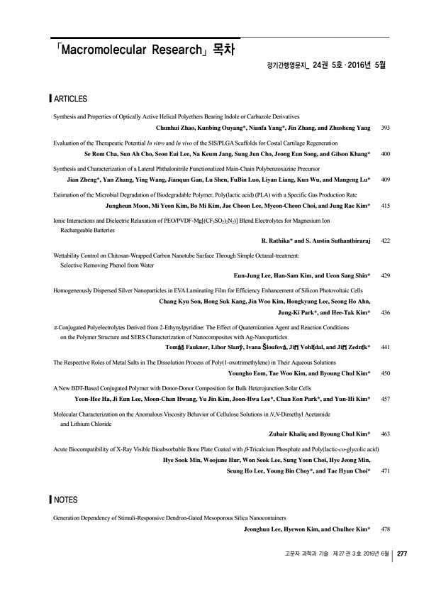 고분자 과학과 기술 제 27 권 3 호 2016년 6월 277 「Macromolecular Research」목차 정기간행영문지_ 24권 5호 ․ 2016년 5월 ARTICLES Synthesis and Properties of Optically Active Helical Polyethers Bearing Indole or Carbazole Derivatives Chunhui Zhao, Kunbing Ouyang*, Nianfa Yang*, Jin Zhang, and Zhusheng Yang 393 Evaluation of the Therapeutic Potential In vitro and In vivo of the SIS/PLGA Scaffolds for Costal Cartilage Regeneration Se Rom Cha, Sun Ah Cho, Seon Eui Lee, Na Keum Jang, Sung Jun Cho, Jeong Eun Song, and Gilson Khang* 400 Synthesis and Characterization of a Lateral Phthalonitrile Functionalized Main-Chain Polybenzoxazine Precursor Jian Zheng*, Yan Zhang, Ying Wang, Jianqun Gan, Lu Shen, FuBin Luo, Liyan Liang, Kun Wu, and Mangeng Lu* 409 Estimation of the Microbial Degradation of Biodegradable Polymer, Poly lactic acid PLA with a Specific Gas Production Rate Jungheun Moon, Mi Yeon Kim, Bo Mi Kim, Jae Choon Lee, Myeon-Cheon Choi, and Jung Rae Kim* 415...
