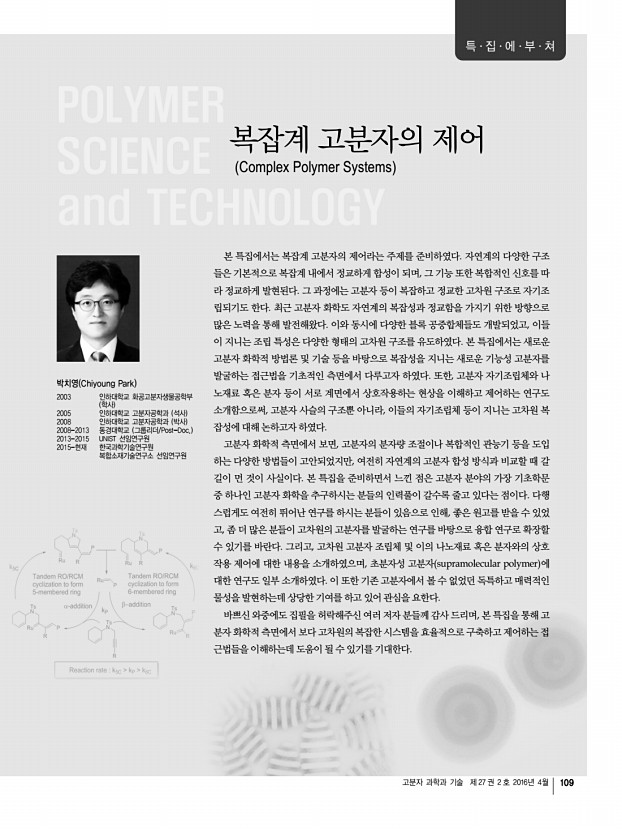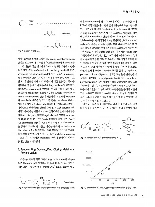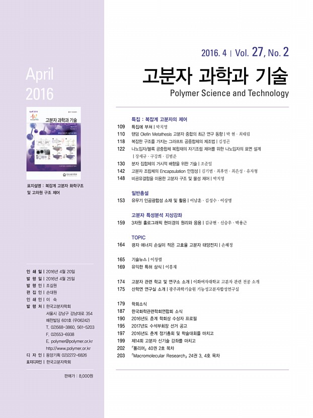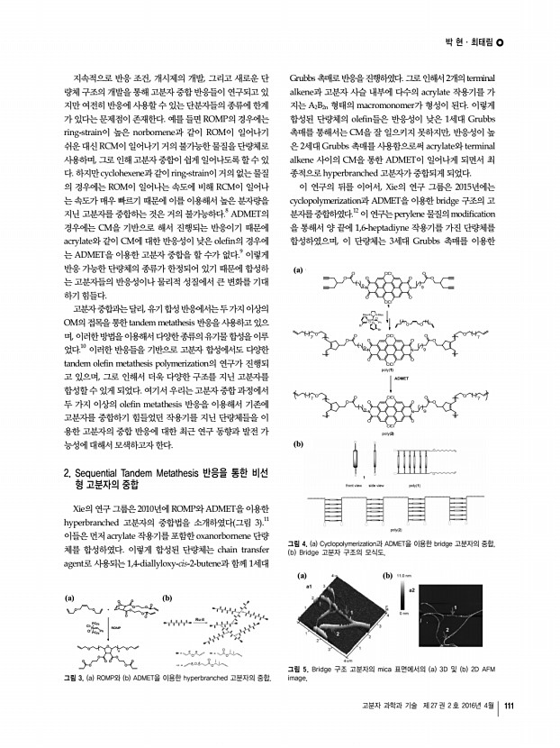 박 현ㆍ최태림 고분자 과학과 기술 제 27 권 2 호 2016년 4월 111 O O O O O O O O O O O + O O O O O O O O O O O n Ru PCy3 Ph Cl Cl PCy3 ROMP a a b b 그림 3. a ROMP와 b ADMET을 이용한 hyperbranched 고분자의 중합. a b 그림 5. Bridge 구조 고분자의 mica 표면에서의 a 3D 및 b 2D AFM image. a b 그림 4. a Cyclopolymerization과 ADMET을 이용한 bridge 고분자의 중합, b Bridge 고분자 구조의 모식도. 지속적으로 반응 조건, 개시제의 개발, 그리고 새로운 단 량체 구조의 개발을 통해 고분자 중합 반응들이 연구되고 있 지만 여전히 반응에 사용할 수 있는 단분자들의 종류에 한계 가 있다는 문제점이 존재한다. 예를 들면 ROMP의 경우에는 ring-strain이 높은 norbornene과 같이 ROM이 일어나기 쉬운 대신 RCM이 일어나기 거의 불가능한 물질을 단량체로 사용하며, 그로 인해 고분자 중합이 쉽게 일어나도록 할 수 있 다. 하...