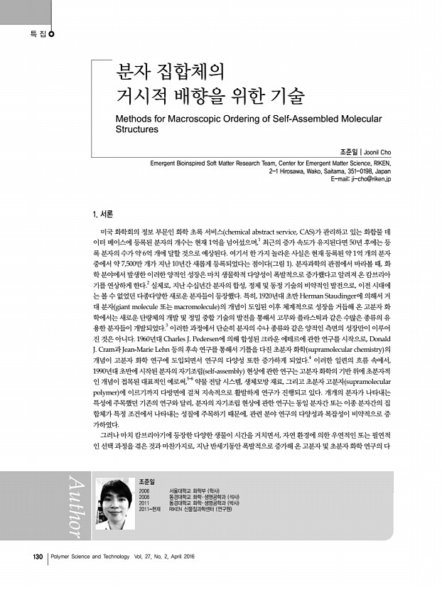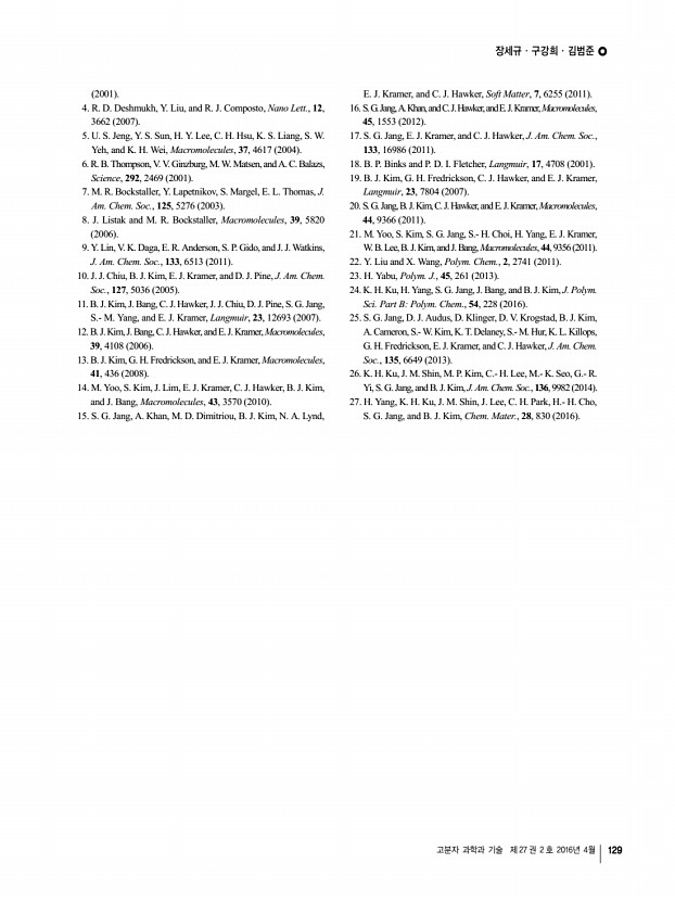 장세규ㆍ구강희ㆍ김범준 고분자 과학과 기술 제 27 권 2 호 2016년 4월 129 2001 4. R. D. Deshmukh, Y. Liu, and R. J. Composto, Nano Lett., 12, 3662 2007 5. U. S. Jeng, Y. S. Sun, H. Y. Lee, C. H. Hsu, K. S. Liang, S. W. Yeh, and K. H. Wei, Macromolecules, 37, 4617 2004 6. R. B. Thompson, V. V. Ginzburg, M. W. Matsen, and A. C. Balazs, Science, 292, 2469 2001 7. M. R. Bockstaller, Y. Lapetnikov, S. Margel, E. L. Thomas, J. Am. Chem. Soc., 125, 5276 2003 8. J. Listak and M. R. Bockstaller, Macromolecules, 39, 5820 2006 9. Y. Lin, V. K. Daga, E. R. Anderson, S. P. Gido, and J. J. Watkins, J. Am. Chem. Soc., 133, 6513 2011 10. J. J. Chiu, B. J. Kim, E. J. Kramer, and D. J. Pine, J. Am. Chem. Soc., 127, 5036 2005 11. B. J. Kim, J. Bang, C. J. Hawker, J. J. Chiu, D. J. Pine, S. G. Jang, S.- M. Yang, and E. J. Kramer, Langmuir, 23, 12693 2007 12. B. J. Kim, J. Bang, C. J. Hawker, and E. J. Kramer, Macromolecules, 39, 4108 2006 13. B. J. Kim, G. H. Fredrickson, and E. J. Kr...