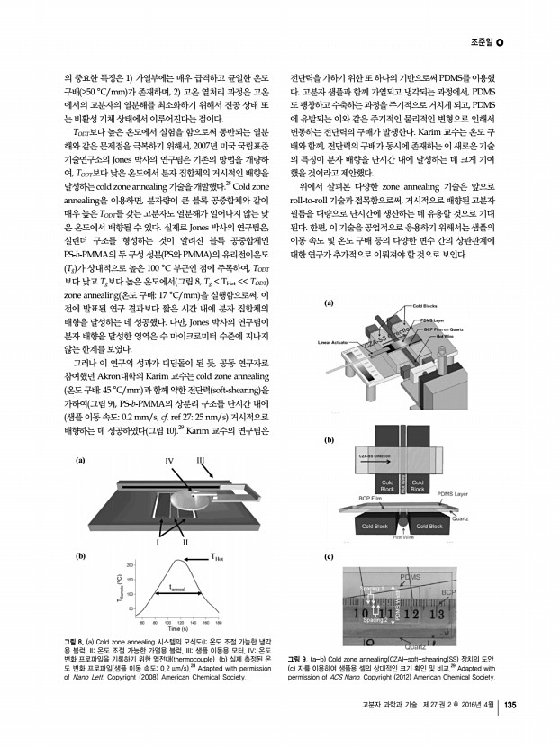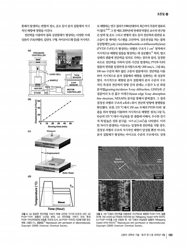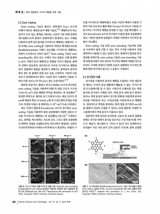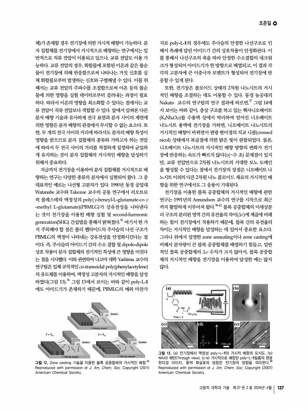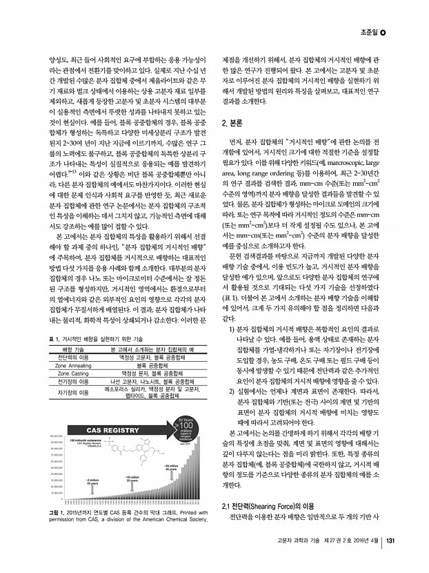 조준일 고분자 과학과 기술 제 27 권 2 호 2016년 4월 131 그림 1. 2015년까지 연도별 CAS 등록 건수의 막대 그래프. Printed with permission from CAS, a division of the American Chemical Society. 배향 기술 본 고에서 소개하는 분자 집합체의 예 전단력의 이용 액정성 고분자, 블록 공중합체 Zone Annealing 블록 공중합체 Zone Casting 액정성 분자, 블록 공중합체 전기장의 이용 나선 고분자, 나노시트, 블록 공중합체 자기장의 이용 메소포러스 실리카, 액정성 분자 및 고분자, 펩타이드, 블록 공중합체 표 1. 거시적인 배향을 실현하기 위한 기술 양성도, 최근 들어 사회적인 요구에 부합하는 응용 가능성이 라는 관점에서 전환기를 맞이하고 있다. 실제로 지난 수십 년 간 개발된 수많은 분자 집합체 중에서 제올라이트와 같은 무 기 재료와 벌크 상태에서 이용하는 상용 고분자 재료 일부...