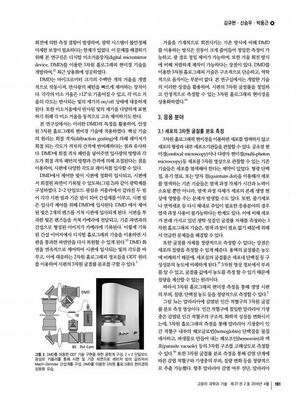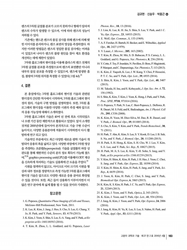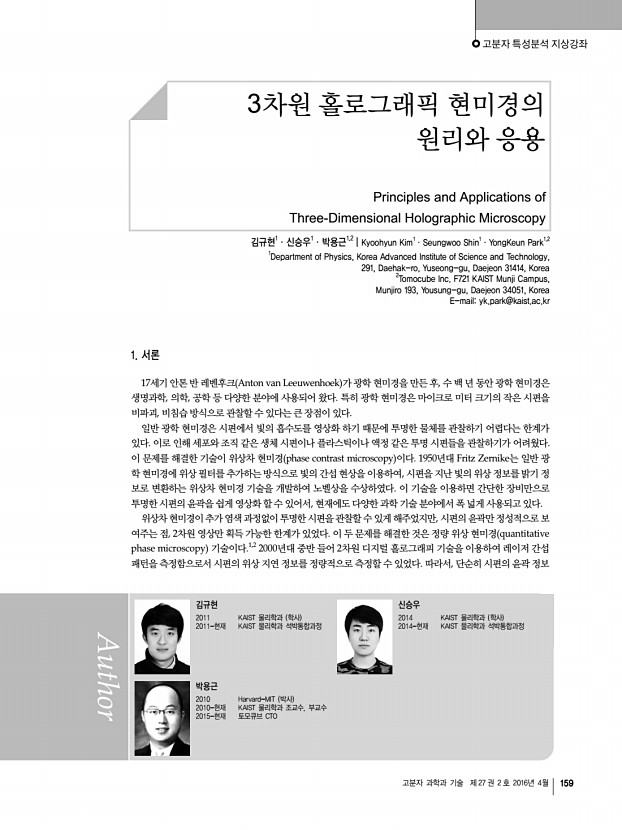 고분자 특성분석 지상강좌 고분자 과학과 기술 제 27 권 2 호 2016년 4월 159 김규현 2011 KAIST 물리학과 학사 2011-현재 KAIST 물리학과 석박통합과정 신승우 2014 KAIST 물리학과 학사 2014-현재 KAIST 물리학과 석박통합과정 박용근 2010 Harvard-MIT 박사 2010-현재 KAIST 물리학과 조교수, 부교수 2015-현재 토모큐브 CTO 3차원 홀로그래픽 현미경의 원리와 응용 Principles and Applications of Three-Dimensional Holographic Microscopy 김규현1ㆍ신승우1ㆍ박용근1,2 | Kyoohyun Kim1ㆍSeungwoo Shin1ㆍYongKeun Park1,2 1 Department of Physics, Korea Advanced Institute of Science and Technology, 291, Daehak-ro, Yuseong-gu, Daejeon 31414, Korea 2 Tomocube Inc. F721 KAIST Munji Campus, Munjiro 193, Yousung-gu, Daejeon 34051, Korea E-mailyk.park@kaist.ac.kr 1. 서론 17세기 안톤 반 레벤후크 Anton van Leeuwenhoek 가 광학 현미경을 만든 후, 수 백 년 동안 광학 현미경은 생명과...