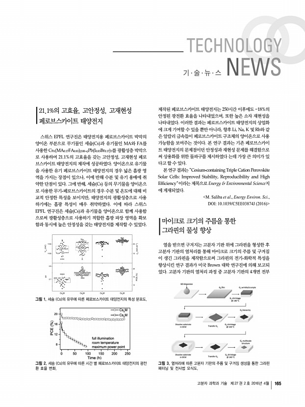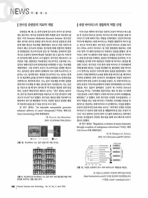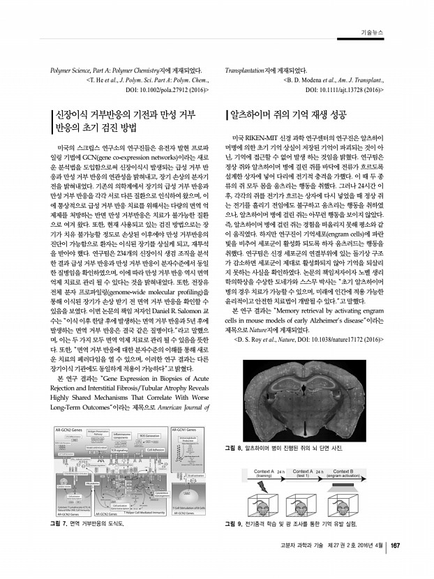 고분자 과학과 기술 제 27 권 2 호 2016년 4월 167 그림 7. 면역 거부반응의 도식도. 그림 8. 알츠하이머 병이 진행된 쥐의 뇌 단면 사진. 그림 9. 전기충격 학습 및 광 조사를 통한 기억 유발 실험. Polymer Science, Part APolymer Chemistry지에 게재되었다. T. He et al., J. Polym. Sci. Part APolym. Chem., DOI10.1002/pola.27912 2016 신장이식 거부반응의 기전과 만성거부 반응의 초기 검진방법 미국의 스크립스 연구소의 연구진들은 유전자 발현 프로파 일링 기법에 GCN gene co-expression networks 이라는 새로 운 분석법을 도입함으로써 신장이식시 발생되는 급성 거부 반 응과 만성 거부 반응의 연관성을 밝혀내고, 장기 손상의 분자기 전을 밝혀내었다. 기존의 의학계에서 장기의 급성 거부 반응과 만성 거부 반응을 각각 서로 다른 질환으로 인식하여 왔으며, 이 에 통상적으로 급성 거부 반응 치...