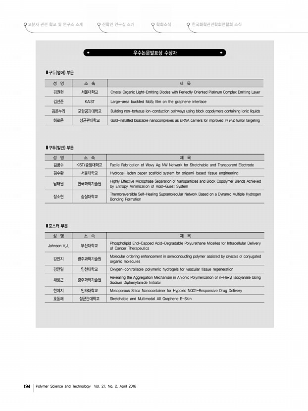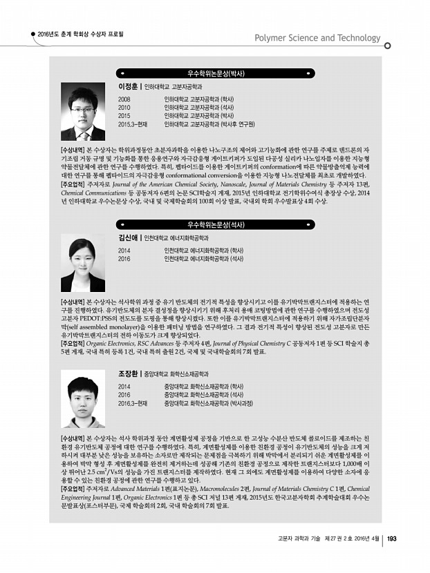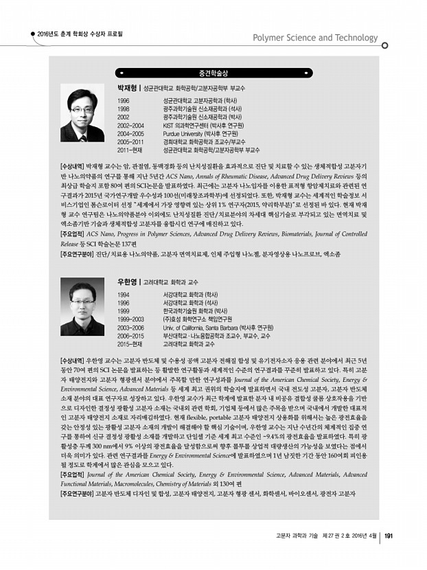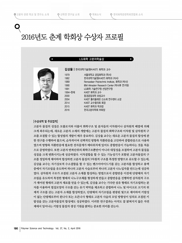 고분자 관련 학교 및 연구소 소개 한국화학관련학회연합회 소식 산학연 연구실 소개 학회소식 190 Polymer Science and Technology Vol. 27, No. 2, April 2016 2016년도 춘계 학회상 수상자 프로필 LG화학 고분자학술상 김상율|한국과학기술원 KAIST 화학과 교수 1979 서울대학교 공업화학과 학사 1982 한국과학기술원 KAIST 화학과 석사 1989 Rensselaer Polytechnic Institute, 화학과 박사 1990 IBM Almaden Research Center 박사후 연구원 1991 LG화학 기술연구원 선임연구원 1994-현재 KAIST 화학과 교수 2000 동경공업대학 초빙교수 2004 KAIST 폴리올레핀 신소재 연구센터 소장 2014 KAIST 교수협의회 회장 2015 KAIST 화학과 학과장 2016 한국고분자학회 부회장 [수상내역 및 주요업적] 고분자 물질의 성질은 모폴로지와 더불어 화학구조 및 분자들의 이차원이나 삼차원적 배열에 의해 크게 좌우되는데, 새로운 ...