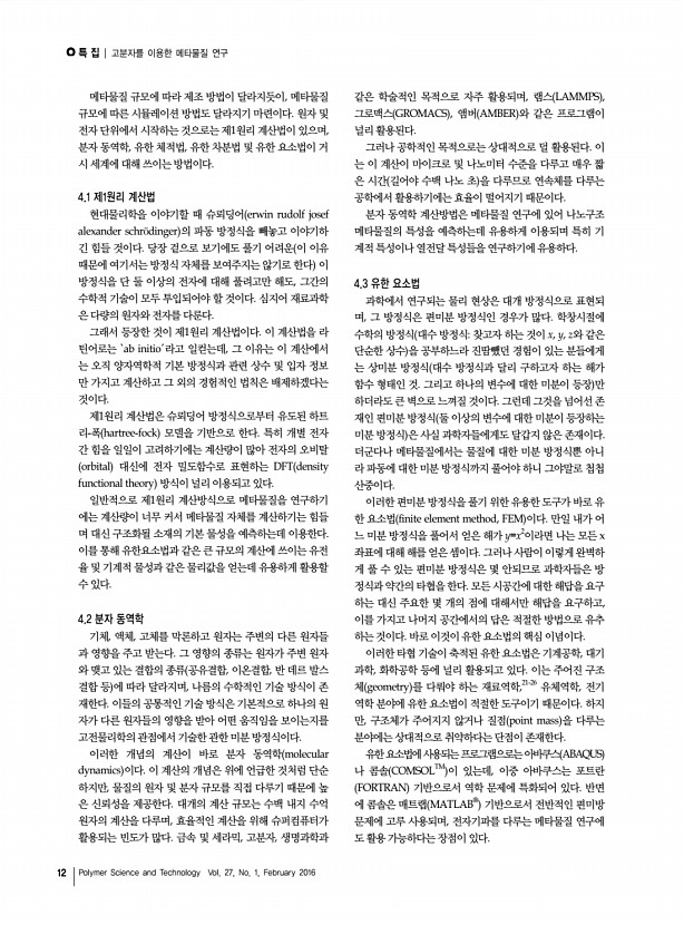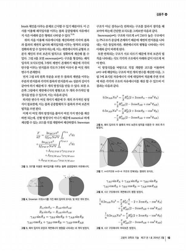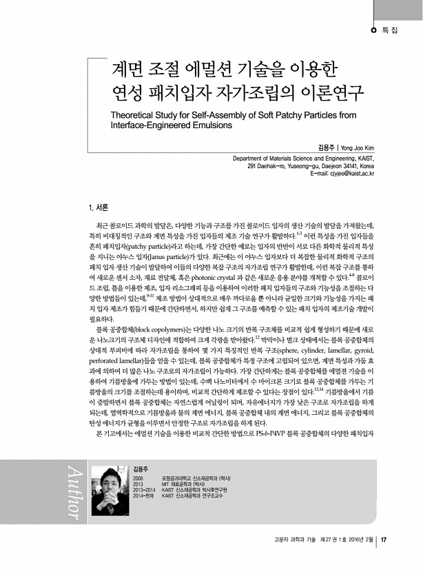 특 집 고분자 과학과 기술 제 27 권 1 호 2016년 2월 17 계면 조절 에멀션 기술을 이용한 연성 패치입자 자가조립의 이론연구 Theoretical Study for Self-Assembly of Soft Patchy Particles from Interface-Engineered Emulsions 김용주 | Yong Joo Kim Department of Materials Science and Engineering, KAIST, 291 Daehak-ro, Yuseong-gu, Daejeon 34141, Korea E-mailcjyjee@kaist.ac.kr 김용주 2008 포항공과대학교 신소재공학과 학사 2013 MIT 재료공학과 박사 2013-2014 KAIST 신소재공학과 박사후연구원 2014-현재 KAIST 신소재공학과 연구조교수 1. 서론 최근 콜로이드 과학의 발달은, 다양한 기능과 구조를 가진 콜로이드 입자의 생산 기술의 발달을 가져왔는데, 특히 비대칭적인 구조와 계면 특성을 가진 입자들의 제조 기술 연구가 활발하다.1-3 이런 특성을 가진 입자들을 흔히 패치입자 patchy particle 라고 하는데, 가장 간단한 예로는 ...