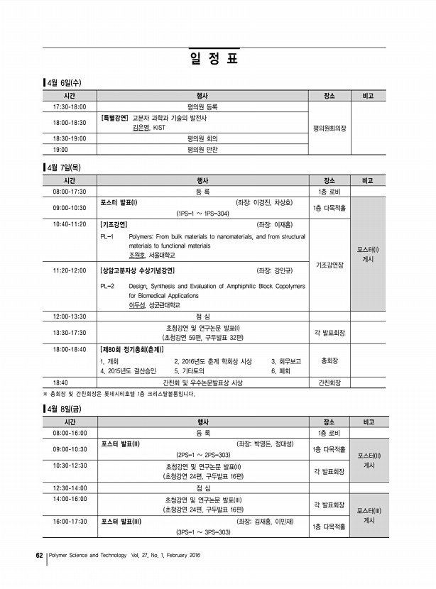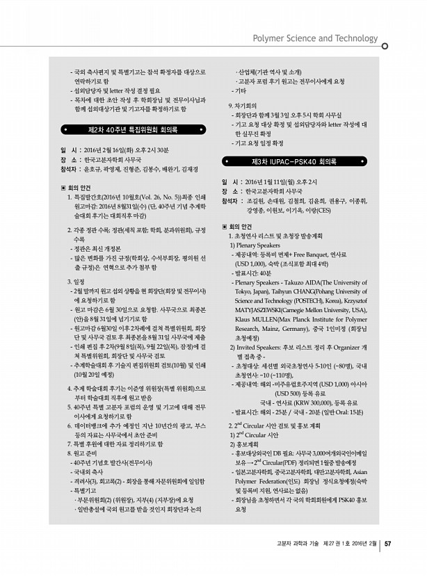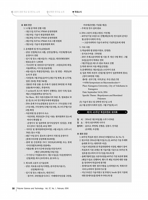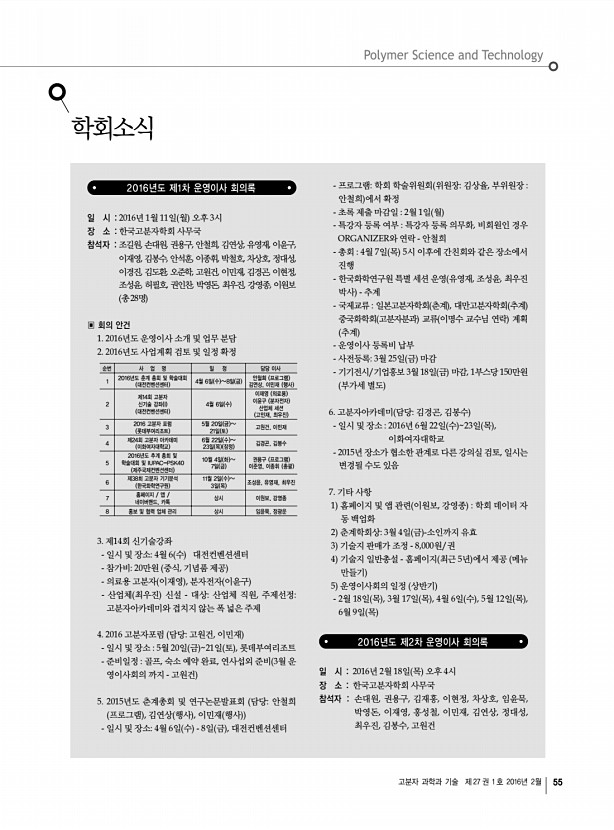 ... 일반총설 홈페이지 최근 5년 에서 제공 메뉴 만들기 5 운영이사회의 일정 상반기 2월 18일 목 , 3월 17일 목 , 4월 6일 수 , 5월 12일 목 , 6월 9일 목 2016년도 제2차 운영이사 회의록 일 시 2016년 2월 18일 목 오후 4시 장 소 한국고분자학회 사무국 참석자 손대원, 권용구, 김재홍, 이현정, 차상호, 임윤묵, 박영돈, 이재영, 홍성철, 이민재, 김연상, 정대성, 최우진, 김봉수, 고원건 고분자 과학과 기술 제 27 권 1 호 2016년 2월 55학회소식