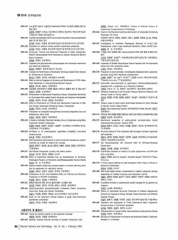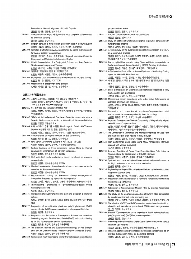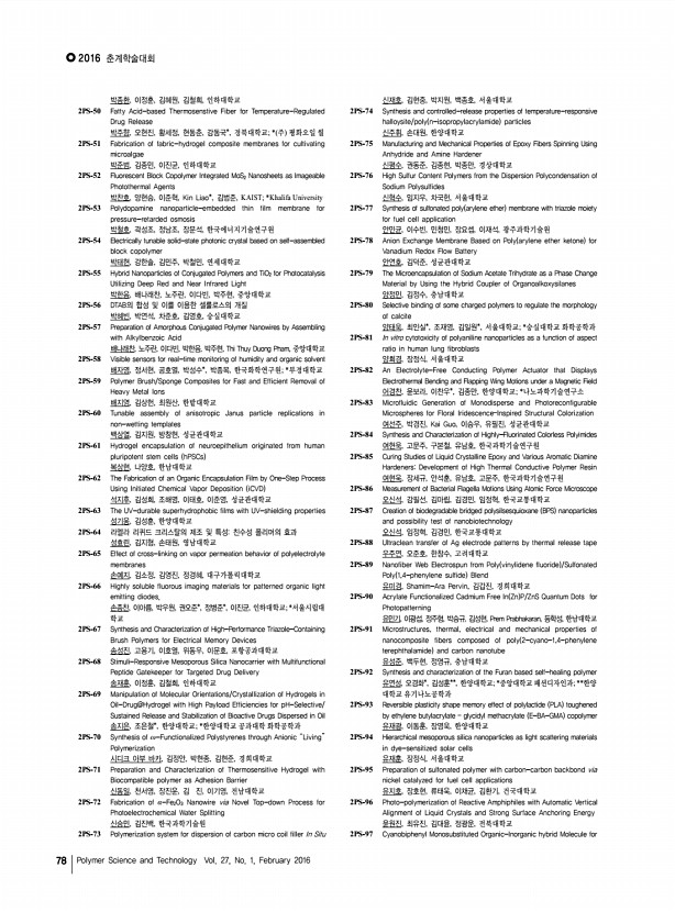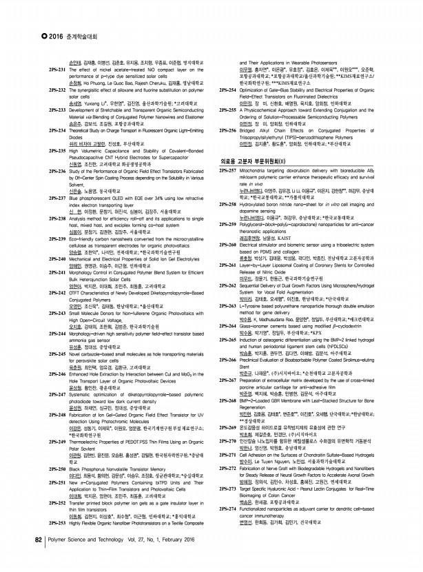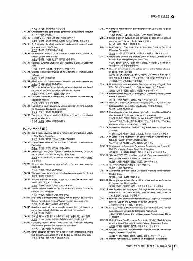 ...Science and Technology Vol. 27, No. 1, February 2016 손인태, 김재홍, 이병선, 김춘호, 유지용, 조치형, 우종표, 이준협, 명지대학교 2PS-231 The effect of nickel acetate-treated NiO compact layer on the performance of p-type dye sensitized solar cells 손창희, Ho Phuong, Le Quoc Bao, Rajesh Cheruku, 김재홍, 영남대학교 2PS-232 The synergisitic effect of siloxane and fluorine substitution on polymer solar cells 송세영, Yuxiang Li*, 우한영*, 김진영, 울산과학기술원; *고려대학교 2PS-233 Development of Stretchable and Transparent Organic Semiconducting Material via Blending of Conjugated Polymer Nanowires and Elastomer 송은주, 강보석, 조길원, 포항공과대학교 2PS-234 Theoretical Study on Charge Transport in Fluorescent Organic Light-Emitting Diodes 쉬리 비자야 고팔란, 진성호, 부산대학교 2PS-235 High Volumetric Capacitance and Stability of Covalent-Bonded Pseudocapacitive CNT Hybrid Electrodes for Supercapacit...