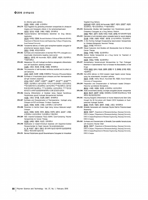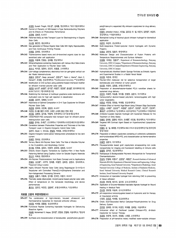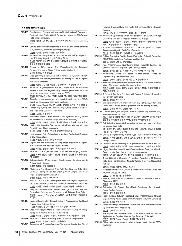연구논문 발표일정 고분자 과학과 기술 제 27 권 1 호 2016년 2월 89 조정민, Suresh Thogiti, 이도경*, 김재홍, 영남대학교; *대구가톨릭대학교 3PS-239 Control of Planarity of NDI-based n-Type Semiconducting Polymers and Its Effects on Photovoltaic Performance 조한희, 김범준, KAIST 3PS-240 Patterned MoO3 as Hole Transport Layer for Electrospinning in Organic Solar Cells 지시영, 황인찬, 광운대학교 3PS-241 New generation of Fibrous Organic Solar Cells With Highly Reproducibility and Fully Continuous Printing Process 진원용, 강재욱, 전북대학교 3PS-242 Triphenylamine based mono and di-branched organic dyes for dye sensitized solar cell application 채강호, 이용희, 안광순, 김재홍, 영남대학교 3PS-243 Dithienothiophene-containing Copolymers with Various Alkyl Side-chains and Their Application to Polymer Solar Cells 최수나, 박지은, 엄현아, 조민주, 최동훈, 고려대학교 3PS-244 Low-voltage complement...