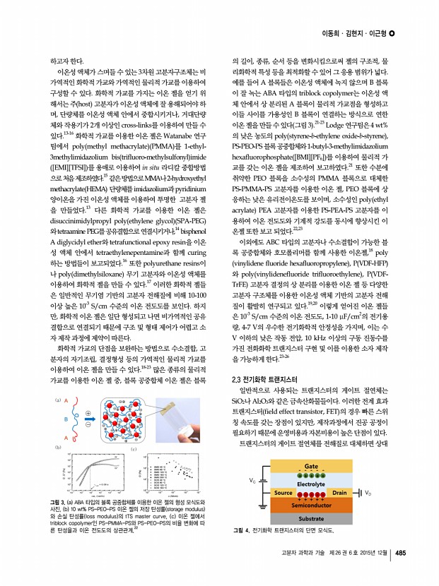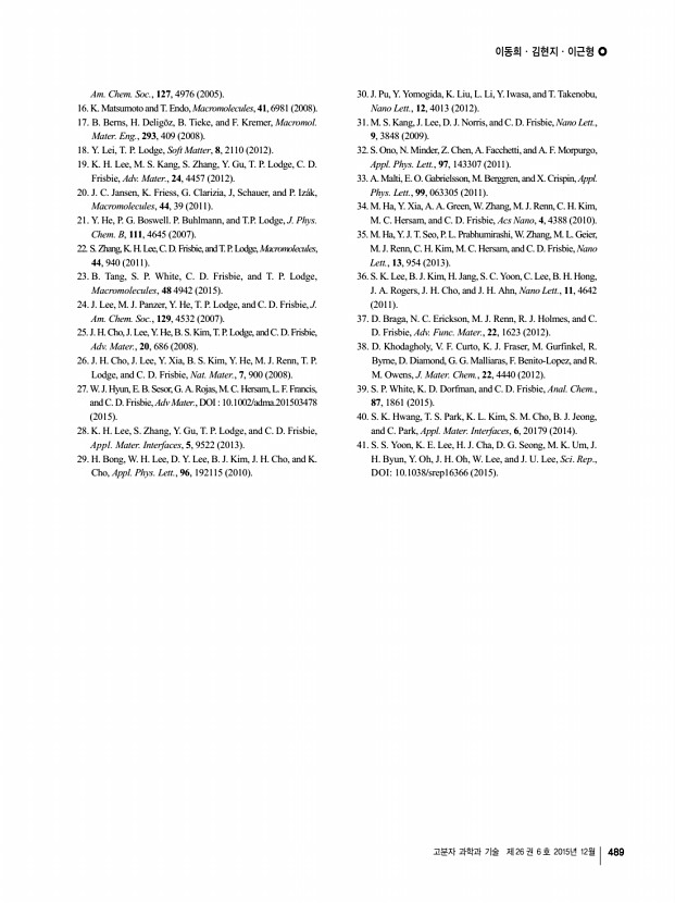 이동희ㆍ김현지ㆍ이근형 고분자 과학과 기술 제 26 권 6 호 2015년 12월 489 Am. Chem. Soc., 127, 4976 2005 16. K. Matsumoto and T. Endo, Macromolecules, 41, 6981 2008 17. B. Berns, H. Deligöz, B. Tieke, and F. Kremer, Macromol. Mater. Eng., 293, 409 2008 18. Y. Lei, T. P. Lodge, Soft Matter, 8, 2110 2012 19. K. H. Lee, M. S. Kang, S. Zhang, Y. Gu, T. P. Lodge, C. D. Frisbie, Adv. Mater., 24, 4457 2012 20. J. C. Jansen, K. Friess, G. Clarizia, J, Schauer, and P. Izák, Macromolecules, 44, 39 2011 21. Y. He, P. G. Boswell. P. Buhlmann, and T.P. Lodge, J. Phys. Chem. B, 111, 4645 2007 22. S. Zhang, K. H. Lee, C. D. Frisbie, and T. P. Lodge, Macromolecules, 44, 940 2011 23. B. Tang, S. P. White, C. D. Frisbie, and T. P. Lodge, Macromolecules, 48 4942 2015 24. J. Lee, M. J. Panzer, Y. He, T. P. Lodge, and C. D. Frisbie, J. Am. Chem. Soc., 129, 4532 2007 25. J. H. Cho, J. Lee, Y. He, B. S. Kim, T. P. Lodge, and C. D. Frisbie, Adv. Mater., 20, 686 2008 26. J. H. Cho, J. L...