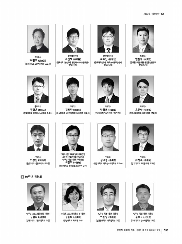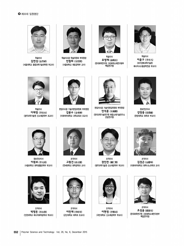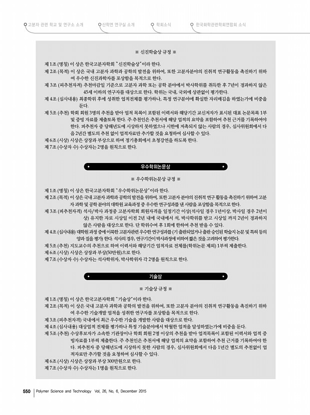 고분자 관련 학교 및 연구소 소개 산학연 연구실 소개 학회소식 한국화학관련학회연합회 소식 550 Polymer Science and Technology Vol. 26, No. 6, December 2015 ※ 신진학술상 규정 ※ 제 1조 명칭 이 상은 한국고분자학회 “신진학술상”이라 한다. 제 2조 목적 이 상은 국내 고분자 과학과 공학의 발전을 위하여, 또한 고분자분야의 진취적 연구활동을 촉진하기 위하 여 우수한 신진과학자를 포상함을 목적으로 한다. 제 3조 피추천자격 추천마감일 기준으로 고분자 과학 또는 공학 분야에서 박사학위를 취득한 후 7년이 경과하지 않은 45세 이하의 연구자를 대상으로 한다. 학위는 국내, 국외에 상관없이 평가한다. 제 4조 심사내용 최종학위 후에 성취한 업적전체를 평가하나, 특정 연구분야에 확실한 자리매김을 하였는가에 비중을 둔다. 제 5조 추천 학회 회원 3명의 추...