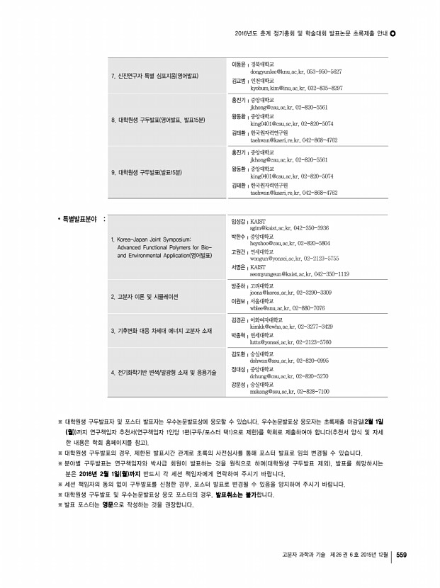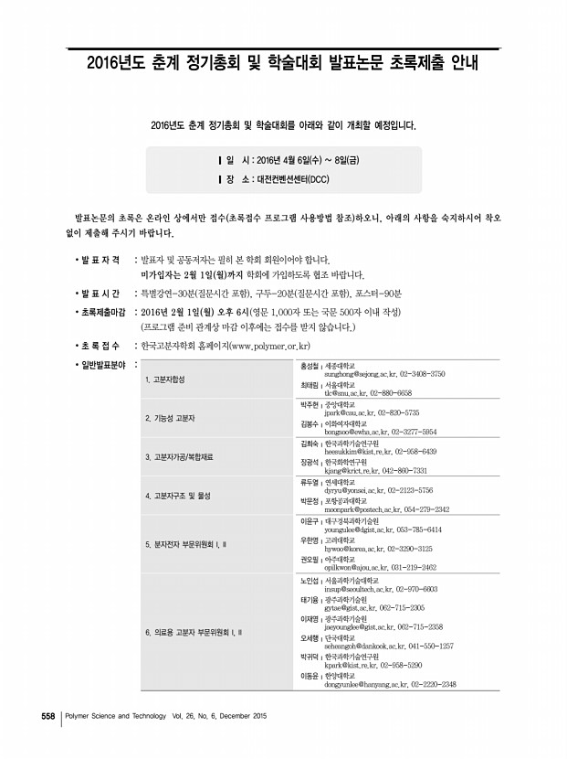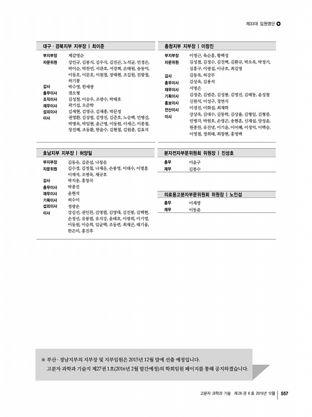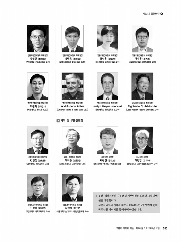 제33대 임원명단 고분자 과학과 기술 제 26 권 6 호 2015년 12월 557 대구ㆍ경북지부 지부장 | 최이준 충청지부 지부장 | 이창진 부지부장 자문위원 감사 총무이사 조직이사 재무이사 섭외이사 이사 제갈영순 강인규, 김봉식, 김우식, 김진곤, 노석균, 민경은, 박이순, 박찬언, 서관호, 서장혁, 손태원, 송동익, 이동호, 이문호, 이원철, 장태현, 조길원, 진왕철, 하기룡 박수영, 한세광 권오형 김성철, 이승우, 조광수, 박태호 곽기섭, 오준학 김세현, 김영규, 김재홍, 박문정 권영환, 김상필, 김영진, 김준호, 노승백, 민병길, 박병욱, 박일현, 윤근병, 이동원, 이세근, 이종철, 장진해, 조동환, 한윤수, 김현철, 김원종, 김효석 부지부장 자문위원 감사 총무이사 재무이사 기획이사 홍보이사 전산이사 이사 이영근, 육순홍, 황택성 김성철, 김정수, 김진백, 김환규, 박오...