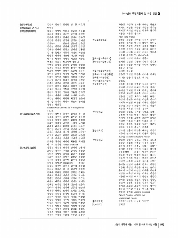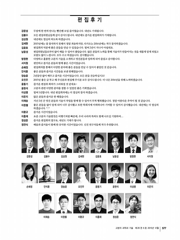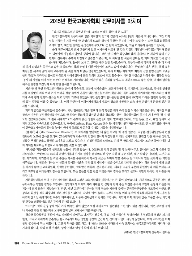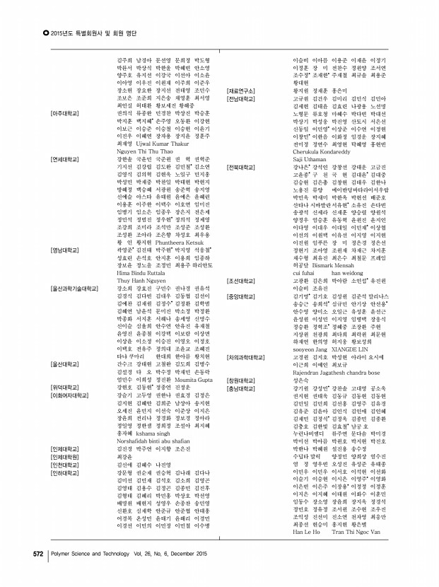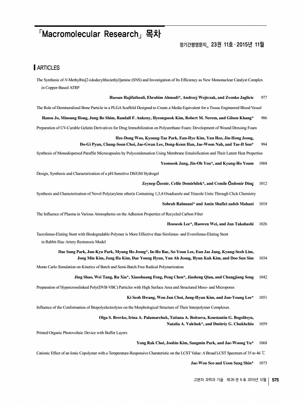 고분자 과학과 기술 제 26 권 6 호 2015년 12월 575 「Macromolecular Research」목차 정기간행영문지_ 23권 11호 ․ 2015년 11월 ARTICLES The Synthesis of N-Methylbis[2- dodecylthio ethyl]amine SNS and Investigation of Its Efficiency as New Mononuclear Catalyst Complex in Copper-Based ATRP Hassan Hajifatheali, Ebrahim Ahmadi*, Andrzej Wojtczak, and Zvonko Jaglicic 977 The Role of Demineralized Bone Particle in a PLGA Scaffold Designed to Create a Media Equivalent for a Tissue Engineered Blood Vessel Hansu Jo, Minsung Hong, Jung Bo Shim, Randall F. Ankeny, Hyeongseok Kim, Robert M. Nerem, and Gilson Khang* 986 Preparation of UV-Curable Gelatin Derivatives for Drug Immobilization on Polyurethane FoamDevelopment of Wound Dressing Foam Hee-Dong Woo, Kyoung-Tae Park, Eun-Hye Kim, Yun Heo, Jin-Hong Jeong, Do-Gi Pyun, Chang-Soon Choi, Jae-Gwan Lee, Dong-Keun Han, Jae-Woon Nah, and Tae-Il Son* 994 Synthesis of Monodispersed Paraffin Microcapsules by Polycondensation Using...