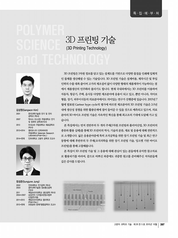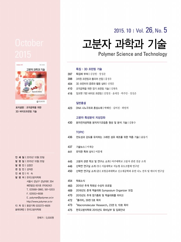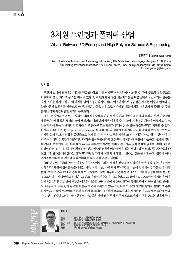 ... October 2015 3차원 프린팅과 폴리머 산업 What’s Between 3D Printing and High Polymer Science & Engineering 홍정우1,2 | Jeong-woo Hong 1 Korea Institute of Science and Technology Information, 245, Daehak-ro, Yuseong-gu, Daejeon 34141, Korea 2 3D Printing Industirial Association, 127, Suchul-daero, Gumi-si, Gyeongsangbuk-do 39268, Korea E-mailjwhong@kisti.re.kr 홍정우 1993 경북대학교 컴퓨터공학과 학사 1995 경북대학교 컴퓨터공학과 석사 1994-현재 한국과학기술정보연구원 중소기업혁신본부 가상설계분석실 책임연구원 2013 경북대학교 IT대학 컴퓨터학부 박사 2013 사 3D 프린팅 산업협회 부회장 1. 서론 생산과 소비의 생태계는 재화를 원료생산하고 이를 넘겨받아 응용하거나 소비하는 관계 구조와 분업구조로 이루어져 있고, 피드백 구조를 지니고 있다. 단위 단계에서 생산되는 재화들은 다음단계로 공급되거나 일부분 자가 소...