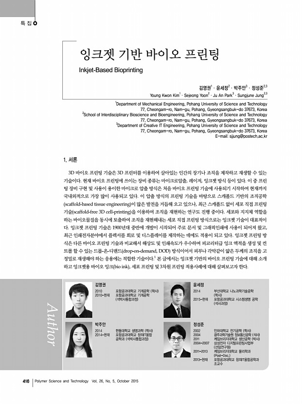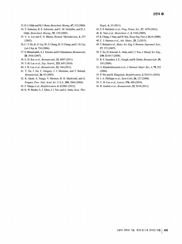 강현욱 고분자 과학과 기술 제 26 권 5 호 2015년 10월 415 33. D. J. Odde and M. J. Renn, Biotechnol. Bioeng., 67, 312 2000 34. Y. Nahmias, R. E. Schwartz, and C. M. Verfaillie, and D. J. Odde, Biotechnol. Bioeng., 92, 129 2005 35. V. A. Liu and S. N. Bhatia, Biomed. Microdevices, 4, 257 2002 36. C.-T. Ho, R.-Z. Lin, W.-Y. Chang, H.-Y. Chang, and C.-H. Liu, Lab Chip, 6, 724 2006 37. S. Ilkhanizadeh, A. I. Teixeira, and O. Hermanson, Biomaterials, 28, 3936 2007 38. E. D. Ker et al., Biomaterials, 32, 8097 2011 39. Y.-B. Lee et al., Exp. Neurol., 223, 645 2010 40. J. W. Lee et al., Biomaterials, 32, 744 2011 41. T. Xu, J. Jin, C. Gregory, J. J. Hickman, and T. Boland, Biomaterials, 26, 93 2005 42. K. Jakab, A. Neagu, V. Mironov, R. R. Markwald, and G. Forgacs, Proc. Natl. Acad. Sci. U.S.A., 101, 2864 2004 43. F. Marga et al., Biofabrication, 4, 022001 2012 44. K. W. Binder, A. J. Allen, J. J. Yoo, and A. Atala, Gene. Ther. Regul., 6, 33 2011 45. F. P. Melchels et al., Prog. ...