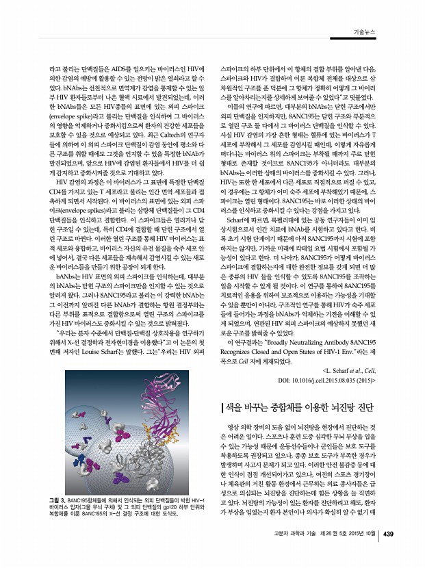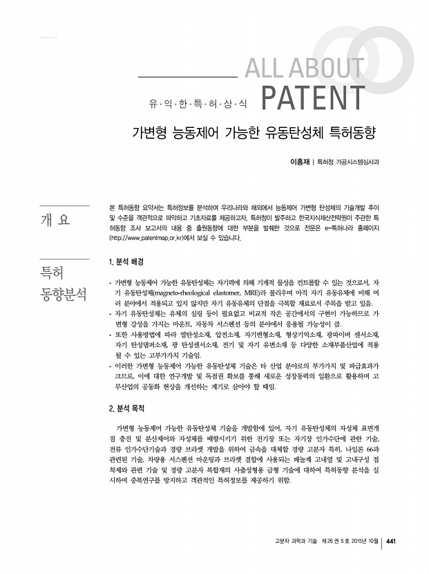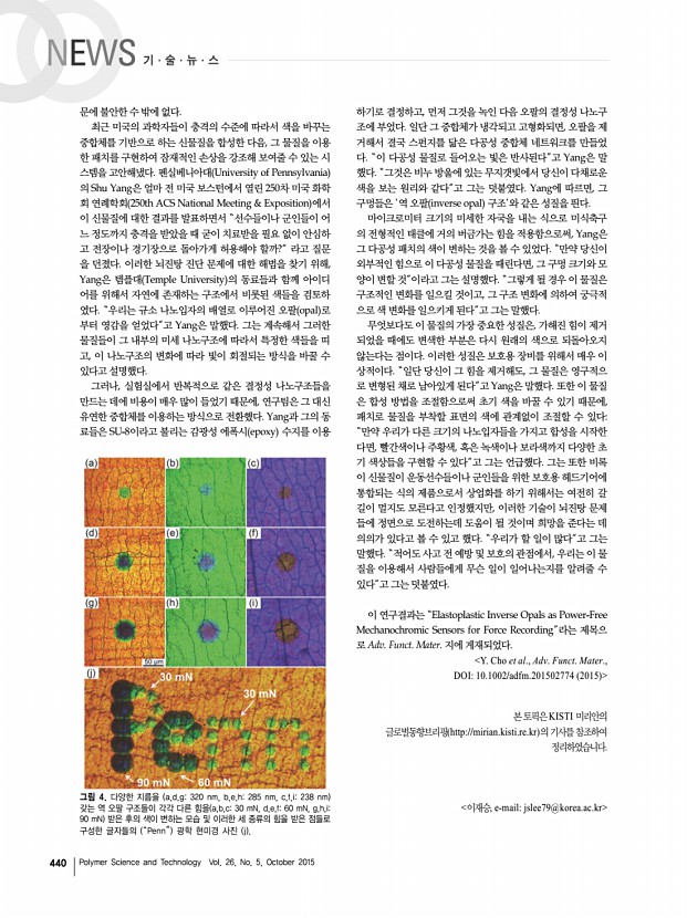 440 Polymer Science and Technology Vol. 26, No. 5, October 2015 그림 4. 다양한 지름을 a,d,g320 nm, b,e,h285 nm, c,f,i238 nm 갖는 역 오팔 구조들이 각각 다른 힘을 a,b,c30 mN, d,e,f60 mN, g,h,i90 mN 받은 후의 색이 변하는 모습 및 이러한 세 종류의 힘을 받은 점들로 구성한 글자들의 “Penn” 광학 현미경 사진 j 문에 불안한 수 밖에 없다. 최근 미국의 과학자들이 충격의 수준에 따라서 색을 바꾸는 중합체를 기반으로 하는 신물질을 합성한 다음, 그 물질을 이용 한 패치를 구현하여 잠재적인 손상을 강조해 보여줄 수 있는 시 스템을 고안해냈다. 펜실베니아대 University of Pennsylvania 의 Shu Yang은 얼마 전 미국 보스턴에서 열린 250차 미국 화학 회 연례학회 250th ACS National Meeting & Exposition 에서 이 신물질에 대한 결과를 발표하면서 “선수들이나 군인들이 어 느 정도까지 충격을 받았을 때 굳...