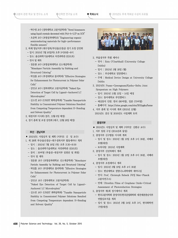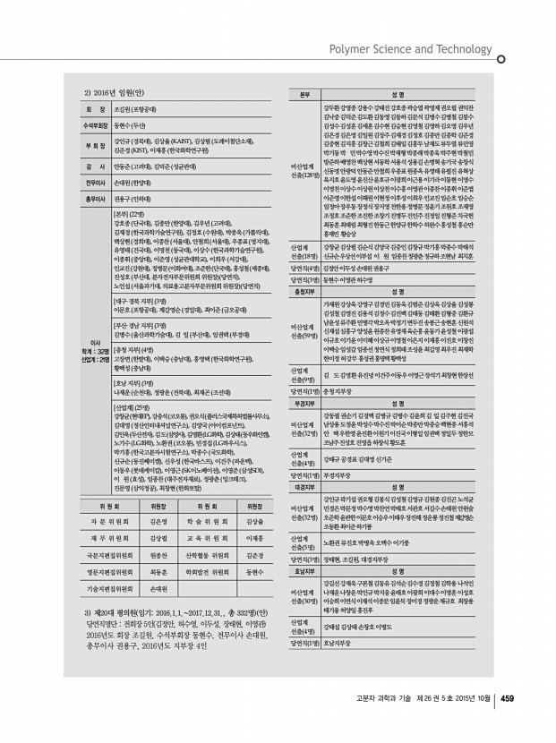 ...회 동현수 기술지편집위원회 손대원 회 장 조길원 포항공대 수석부회장 동현수 두산 부 회 장 강인규 경북대 , 김상율 KAIST , 김상필 도레이첨단소재 , 김준경 KIST , 이재흥 한국화학연구원 감 사 안동준 고려대 , 김덕준 성균관대 전무이사 손대원 한양대 총무이사 권용구 인하대 이사 학계 32명 산업계 21명 [본부] 22명 강호종 단국대 , 김종만 한양대 , 김우년 고려대 , 김재경 한국과학기술연구원 , 김정호 수원대 , 박종욱 가톨릭대 , 백상현 경희대 ,이종찬 서울대 ,안철희 서울대 ,우종표 명지대 , 유영태 건국대 , 이명천 동국대 , 이상수 한국과학기술연구원 , 이종휘 중앙대 , 이준영 성균관대학교 , 이희우 서강대 , 인교진 강원대 ,정병문 이화여대 ,조준한 단국대 ,홍성철 세종대 , 진성호 부산대, 분자전자부문위원회 위원장 당연직 , 노인섭 서울과기대, ...