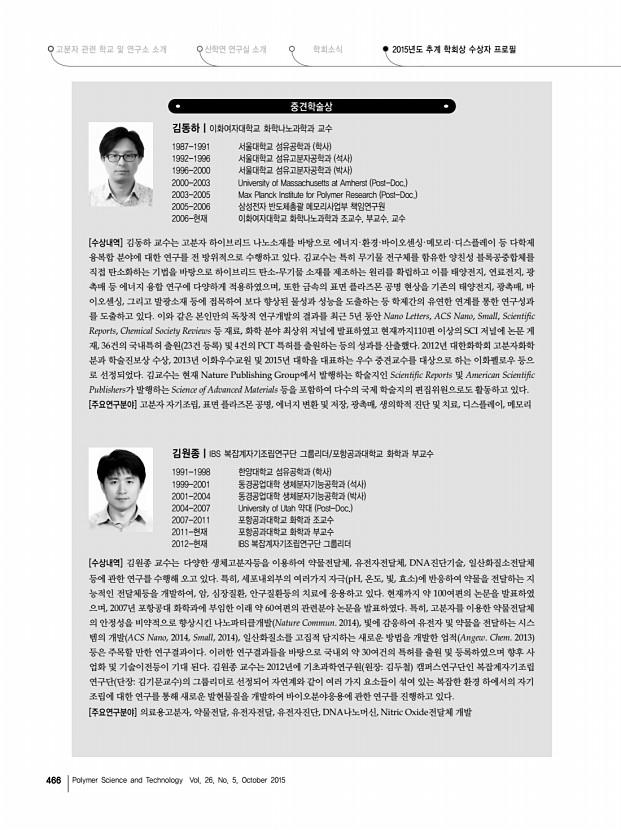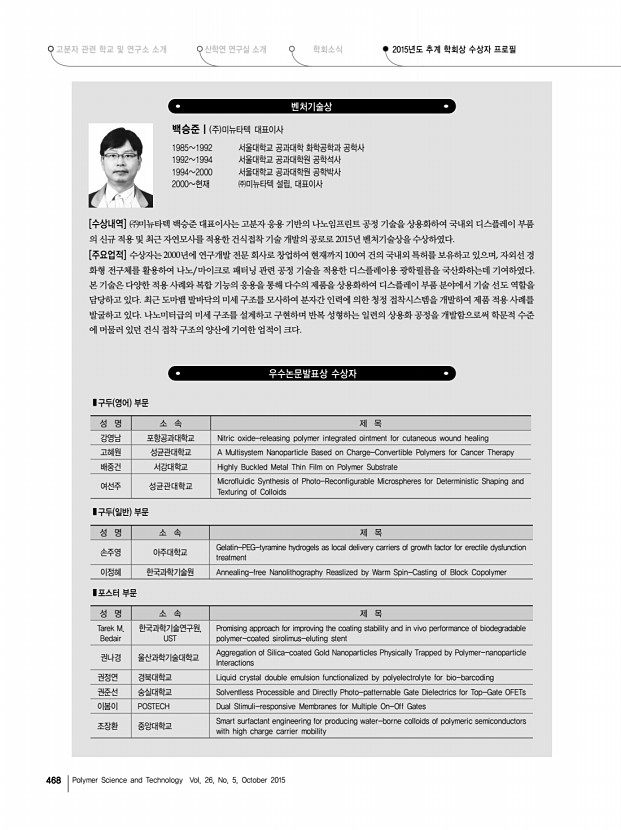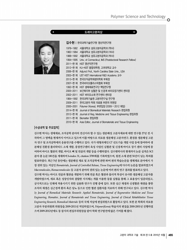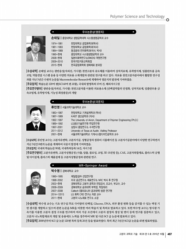 고분자 과학과 기술 제 26 권 5 호 2015년 10월 467 우수논문상 영문지 손태일|중앙대학교 생명공학대학 시스템생명공학과 교수 1974-1981 한양대학교 공업화학과 학사 1981-1983 한양대학교 공업화학과 석사 1984-1989 동경공대 전자화학과 석사, 박사 1990-현재 중앙대학교 시스템생명공학과 교수 2008-현재 일본이화학연구소 RIKEN 객원연구원 2009-2010 한국키틴키토산학회장 2015-현재 한국공업화학회 생체재료 분과장 [수상내역] 손태일 교수는 광반응성 자외선, 가시광 천연고분자 유도체를 이용하여 상처치료제, 유착방지제, 임플란트용 금속 코팅, 약물전달 시스템 응용 등 다양한 의료용 소재개발과 관련된 연구를 하고 있다. 의료용 천연고분자분야에서 활발한 연구성 과를 지난 3년간 수편의 논문을 Macromolecular Research에 게재하여 영문지의 발전에 기여하였음. [...