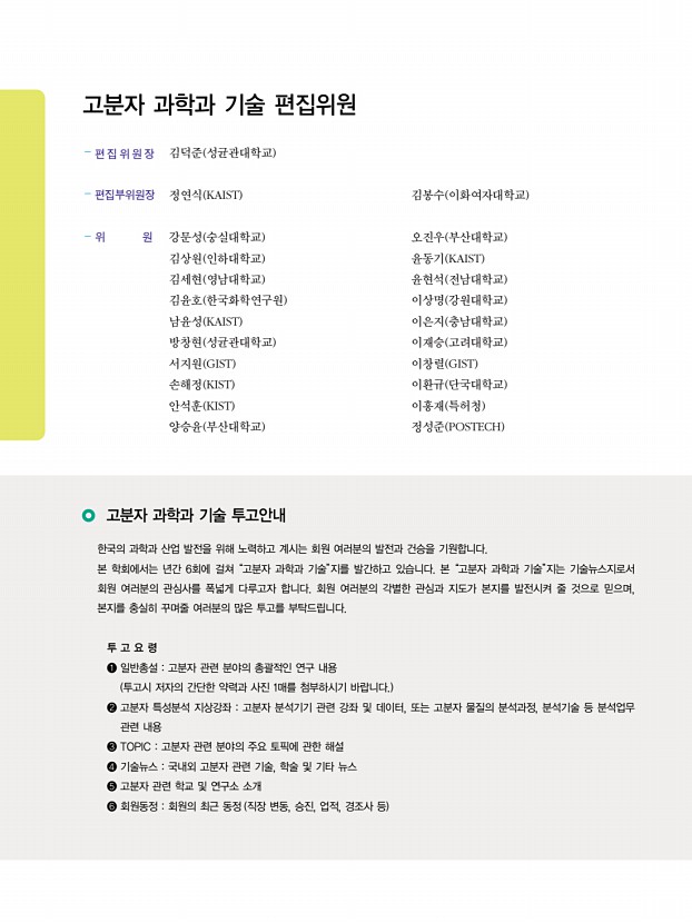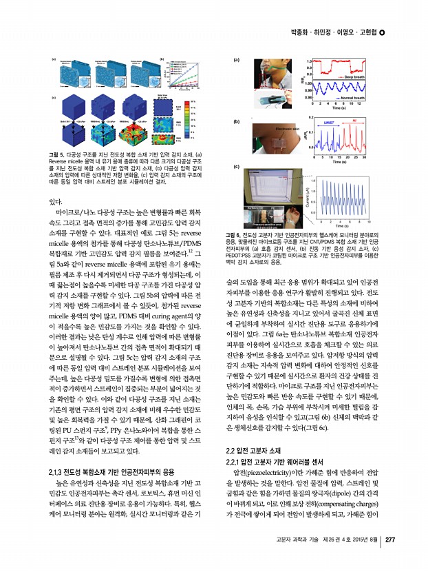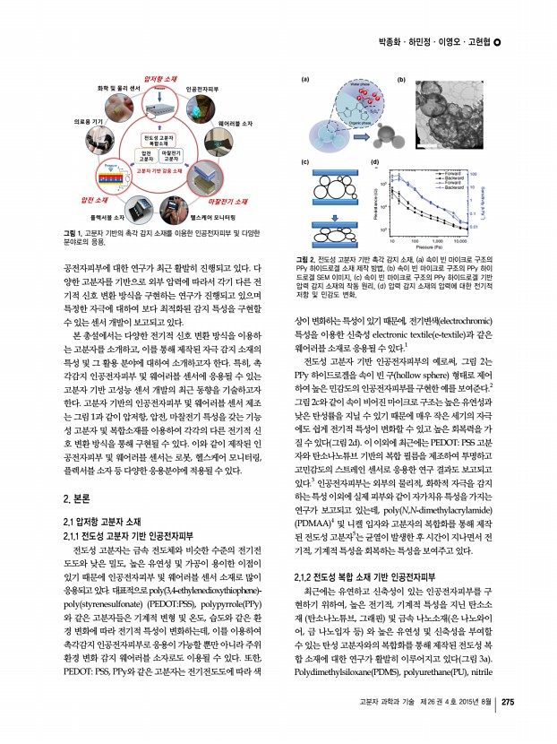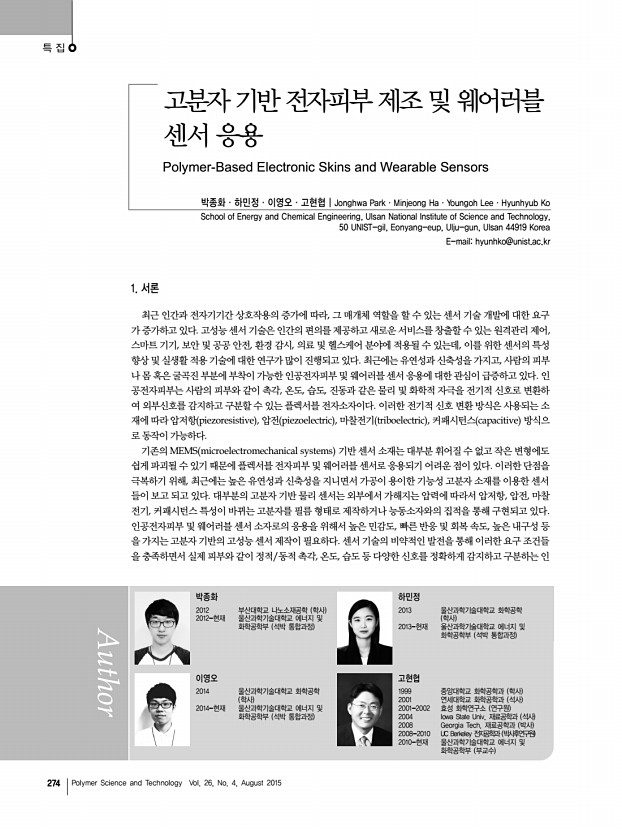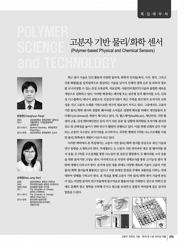 고분자 과학과 기술 제 26 권 4 호 2015년 8월 273 고분자 기반 물리/화학 센서 Polymer-based Physical and Chemical Sensors 최근 센서 기술은 인간 활동의 다양한 물리적, 화학적 인자들 촉각, 시각, 청각, 그리고 각종 화합물 을 일차원적으로 센싱하는 기술을 넘어서 인체의 생체 신호 및 외부의 정보 를 모니터링할 수 있는 감성 로봇공학, 의료공학, 사물인터넷 IOT 기술과 융합한 새로운 개념으로 진화하고 있다. 이러한 배경에는 패치형 또는 섬유형 등의 웨어러블 소자, 신축 성 디스플레이/에너지 융합소자, 인공감각기관이 최근 주목을 받으면서 초저가의 신축 성을 지닌 고분자 소재를 기반으로한 연구의 필요성이 커지고 있다. 그중에서도 고분자 기반 물리/화학 센서와 결합한 웨어러블 소자들은 경쟁력 확보를 위해서 개인맞춤의 온 디맨드 on-demand 개념이 제시...