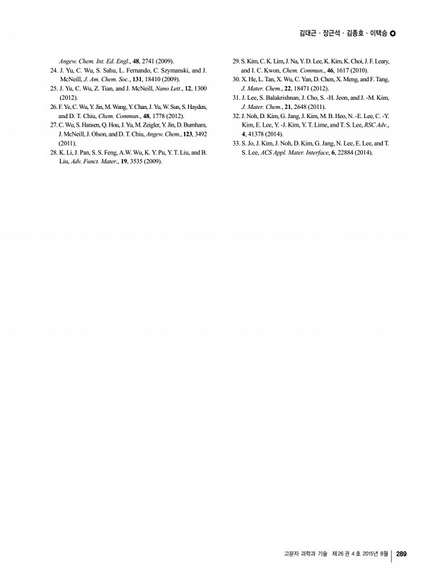 김대근ㆍ장근석ㆍ김종호ㆍ이택승 고분자 과학과 기술 제 26 권 4 호 2015년 8월 289 Angew. Chem. Int. Ed. Engl., 48, 2741 2009 24. J. Yu, C. Wu, S. Sahu, L. Fernando, C. Szymanski, and J. McNeill, J. Am. Chem. Soc., 131, 18410 2009 25. J. Yu, C. Wu, Z. Tian, and J. McNeill, Nano Lett., 12, 1300 2012 26. F. Ye, C. Wu, Y. Jin, M. Wang, Y. Chan, J. Yu, W. Sun, S. Hayden, and D. T. Chiu, Chem. Commun., 48, 1778 2012 27. C. Wu, S. Hansen, Q. Hou, J. Yu, M. Zeigler, Y. Jin, D. Burnham, J. McNeill, J. Olson, and D. T. Chiu, Angew. Chem., 123, 3492 2011 28. K. Li, J. Pan, S. S. Feng, A.W. Wu, K. Y. Pu, Y. T. Liu, and B. Liu, Adv. Funct. Mater., 19, 3535 2009 29. S. Kim, C. K. Lim, J. Na, Y. D. Lee, K. Kim, K. Choi, J. F. Leary, and I. C. Kwon, Chem. Commun., 46, 1617 2010 30. X. He, L. Tan, X. Wu, C. Yan, D. Chen, X. Meng, and F. Tang, J. Mater. Chem., 22, 18471 2012 31. J. Lee, S. Balakrishnan, J. Cho, S. -H. Jeon, and J. -M. Kim, J. Mater. Chem., 21, 2648 2011 32. J. N...